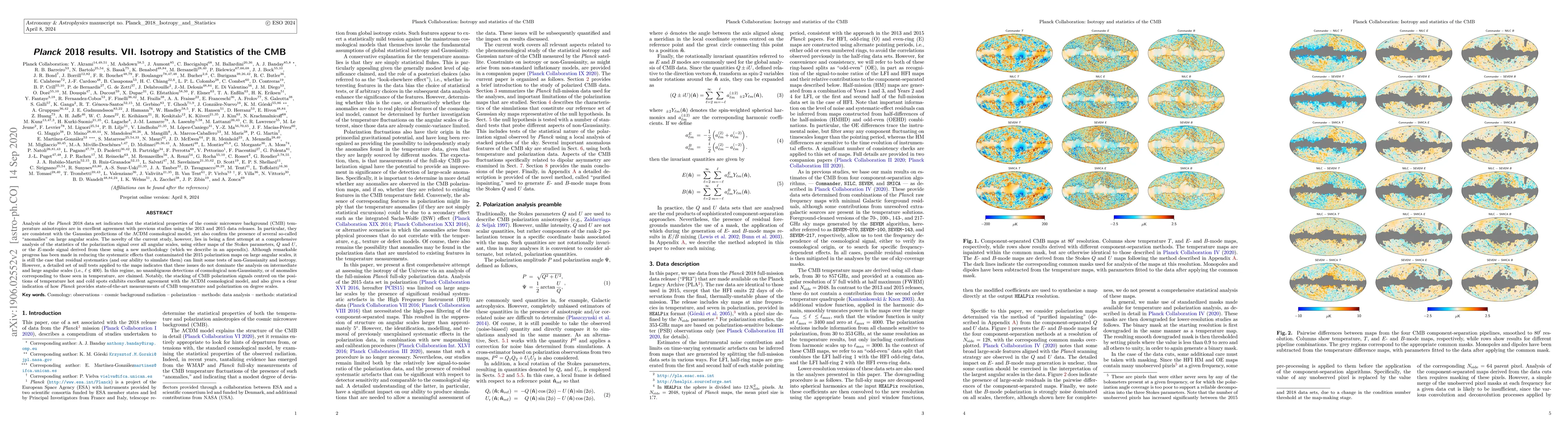 The Planck 2018 results confirm that the CMB's statistical properties align with the LambdaCDM model, but also reveal several large-scale anomalies. The analysis of polarization signals indicates excellent agreement with the model on degree scales, providing state-of-the-art measurements of temperature and polarization.