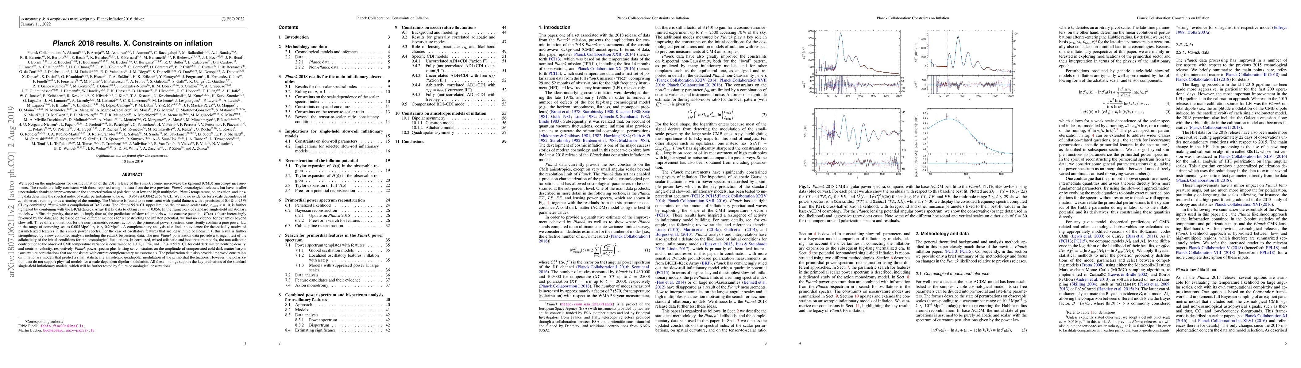 We report on the implications for cosmic inflation of the 2018 Release of the Planck CMB anisotropy measurements. The results are fully consistent with the two previous Planck cosmological releases, but have smaller uncertainties thanks to improvements in the characterization of polarization at low and high multipoles. Planck temperature, polarization, and lensing data determine the spectral index of scalar perturbations to be $n_\mathrm{s}=0.9649\pm 0.0042$ at 68% CL and show no evidence for a scale dependence of $n_\mathrm{s}.$ Spatial flatness is confirmed at a precision of 0.4% at 95% CL with the combination with BAO data. The Planck 95% CL upper limit on the tensor-to-scalar ratio, $r_{0.002}<0.10$, is further tightened by combining with the BICEP2/Keck Array BK15 data to obtain $r_{0.002}<0.056$. In the framework of single-field inflationary models with Einstein gravity, these results imply that: (a) slow-roll models with a concave potential, $V" (\phi) < 0,$ are increasingly favoured by the data; and (b) two different methods for reconstructing the inflaton potential find no evidence for dynamics beyond slow roll. Non-parametric reconstructions of the primordial power spectrum consistently confirm a pure power law. A complementary analysis also finds no evidence for theoretically motivated parameterized features in the Planck power spectrum, a result further strengthened for certain oscillatory models by a new combined analysis that includes Planck bispectrum data. The new Planck polarization data provide a stringent test of the adiabaticity of the initial conditions. The polarization data also provide improved constraints on inflationary models that predict a small statistically anisotropic quadrupolar modulation of the primordial fluctuations. However, the polarization data do not confirm physical models for a scale-dependent dipolar modulation.