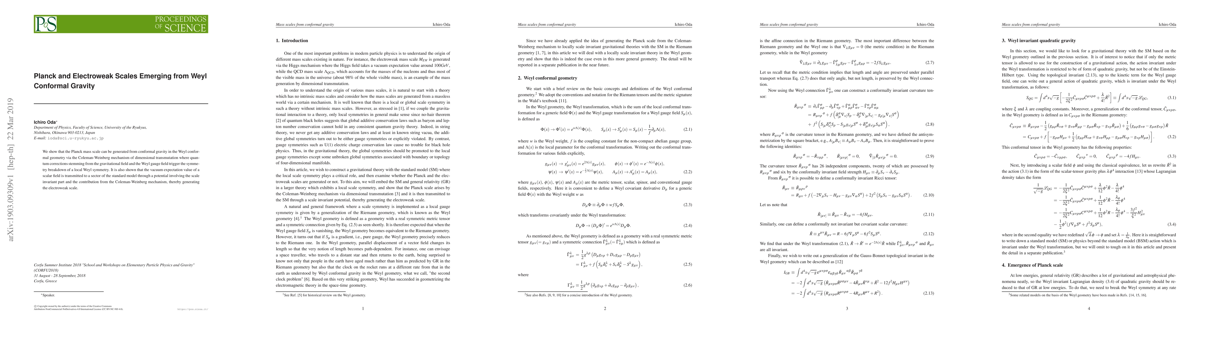This paper demonstrates how the Planck mass scale arises from Weyl conformal gravity through dimensional transmutation and shows that the electroweak scale emerges from a scalar field's vacuum expectation value influenced by the Coleman-Weinberg mechanism.