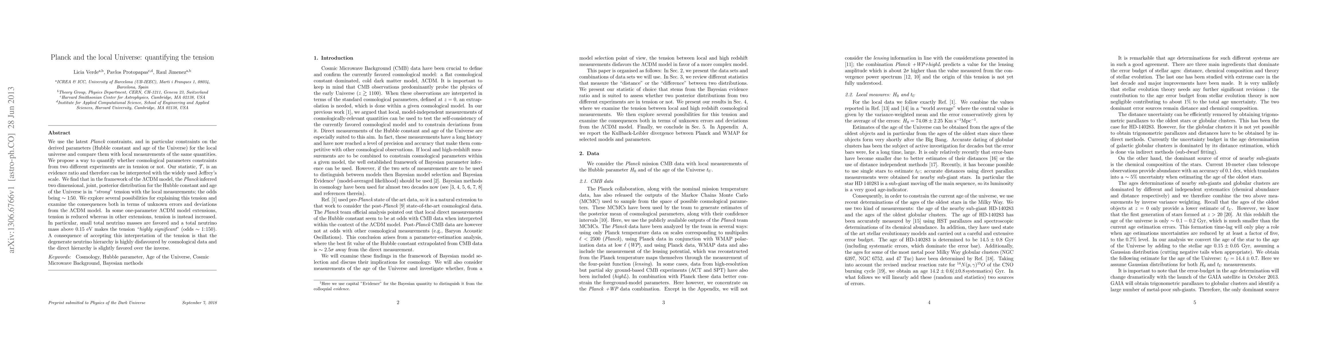 We use the latest Planck constraints, and in particular constraints on the derived parameters (Hubble constant and age of the Universe) for the local universe and compare them with local measurements of the same quantities. We propose a way to quantify whether cosmological parameters constraints from two different experiments are in tension or not. Our statistic, T, is an evidence ratio and therefore can be interpreted with the widely used Jeffrey's scale. We find that in the framework of the LCDM model, the Planck inferred two dimensional, joint, posterior distribution for the Hubble constant and age of the Universe is in "strong" tension with the local measurements; the odds being ~ 1:50. We explore several possibilities for explaining this tension and examine the consequences both in terms of unknown errors and deviations from the LCDM model. In some one-parameter LCDM model extensions, tension is reduced whereas in other extensions, tension is instead increased. In particular, small total neutrino masses are favored and a total neutrino mass above 0.15 eV makes the tension "highly significant" (odds ~ 1:150). A consequence of accepting this interpretation of the tension is that the degenerate neutrino hierarchy is highly disfavoured by cosmological data and the direct hierarchy is slightly favored over the inverse.