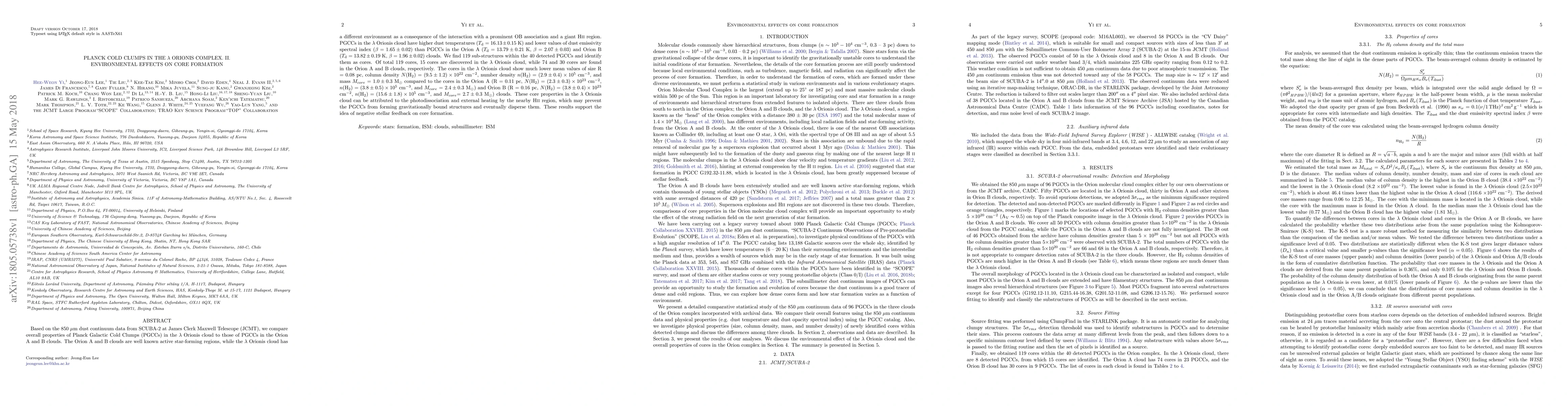 This study, using SCUBA-2 data from JCMT, compares Planck Galactic Cold Clumps (PGCCs) in the λ Orionis cloud to those in Orion A and B. It finds that PGCCs in λ Orionis have higher temperatures and lower emissivity indices, likely due to external heating from a nearby Hii region. This environment prevents the formation of gravitationally bound structures, suggesting negative feedback on core formation.