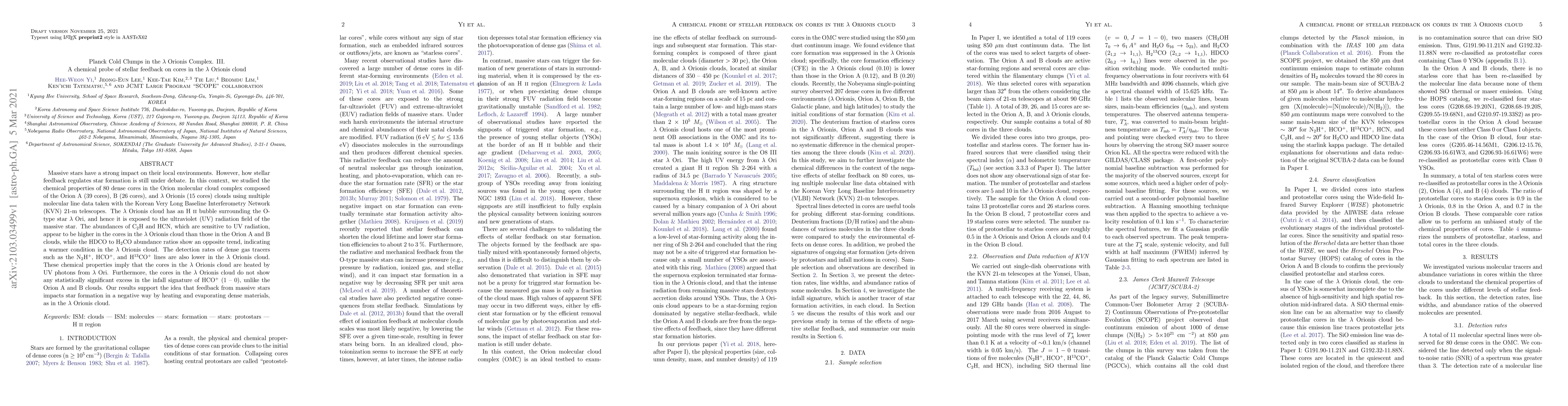 This study investigates the chemical properties of 80 dense cores in the Orion molecular cloud complex, finding that cores in the lambda Orionis cloud, exposed to UV radiation from the nearby O-type star, show higher abundances of C2H and HCN and lower detection rates of dense gas tracers, suggesting heating and evaporation of dense material due to stellar feedback. This implies that massive stars negatively impact star formation by heating and evaporating dense cores.