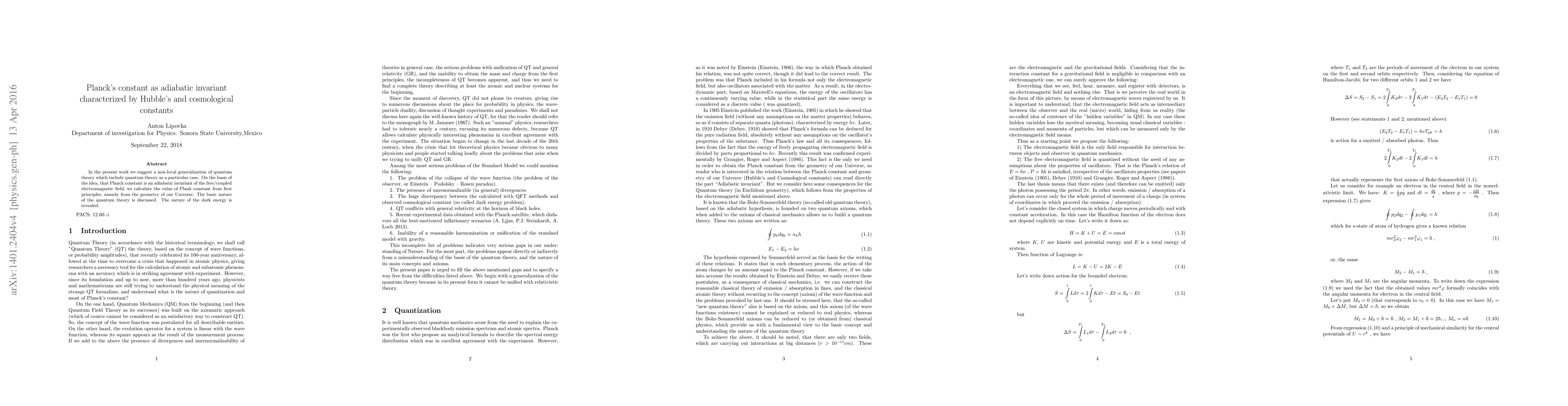 The research proposes a non-local generalization of quantum theory, suggesting that Planck's constant is an adiabatic invariant of the electromagnetic field based on the Universe's geometry. It derives the value of Planck's constant from first principles, discusses the nature of quantum mechanics, and reveals the nature of dark energy.