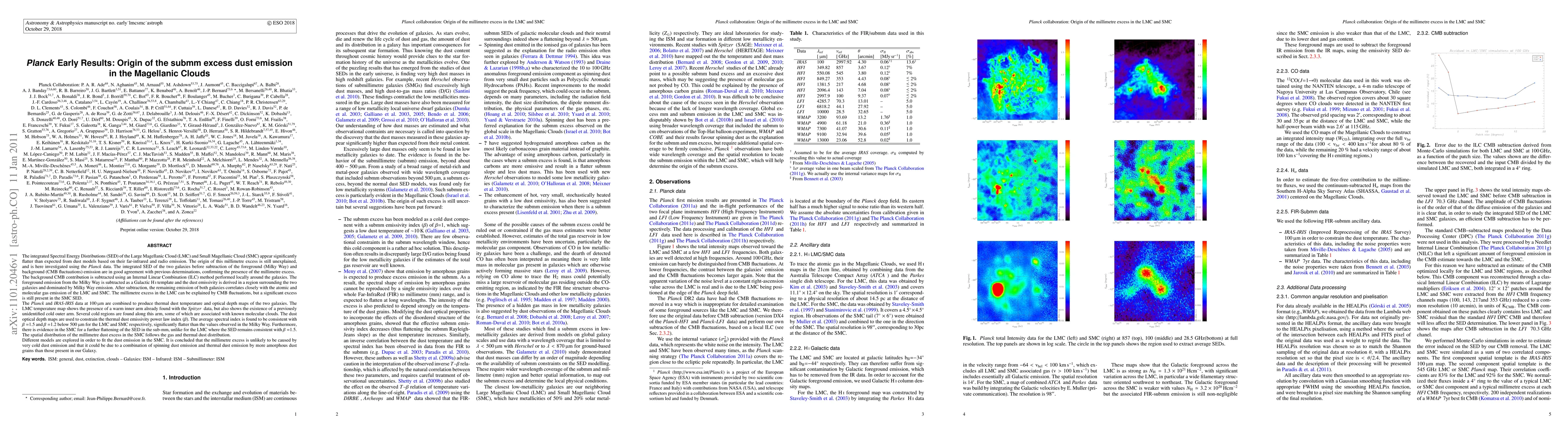 The Planck Early Results study reveals that the submillimeter dust emission in the Magellanic Clouds is flatter than expected, with the Large Magellanic Cloud (LMC) showing an excess explained by CMB fluctuations, but the Small Magellanic Cloud (SMC) still exhibiting a significant excess. The study suggests that the excess in the SMC may result from a combination of spinning dust emission and thermal dust from more amorphous grains.