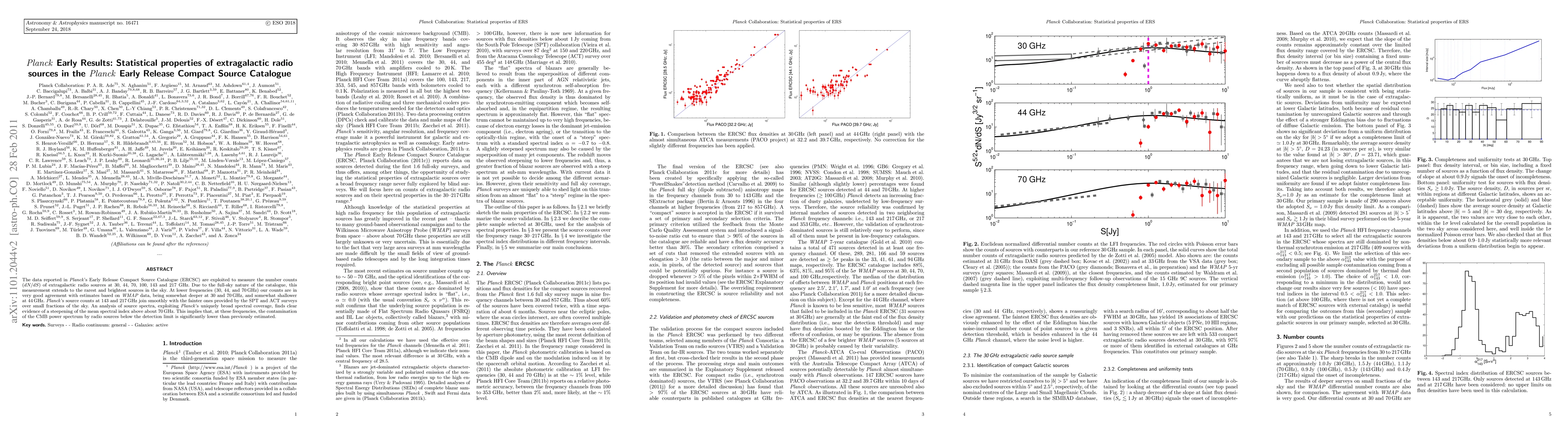 The Planck Early Release Compact Source Catalogue measures the number counts of extragalactic radio sources across multiple frequencies, showing good agreement with WMAP data at lower frequencies and smooth transitions with SPT and ACT surveys at higher frequencies. Analysis reveals a steepening of the mean spectral index above 70 GHz, indicating reduced contamination of the CMB power spectrum by radio sources.