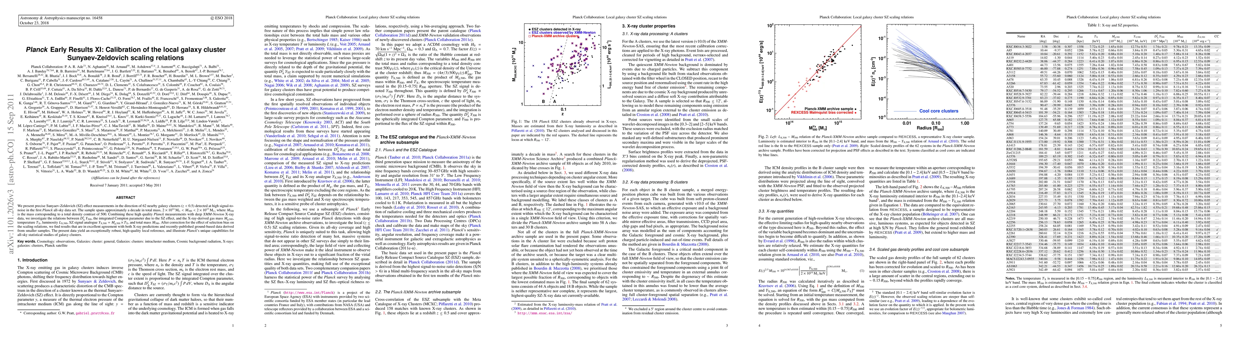 This paper presents precise Sunyaev-Zeldovich effect measurements for 62 nearby galaxy clusters, combining Planck and XMM-Newton data to investigate scaling relations. The results show excellent agreement with X-ray predictions and ground-based data, highlighting Planck's potential for large-scale cluster studies.