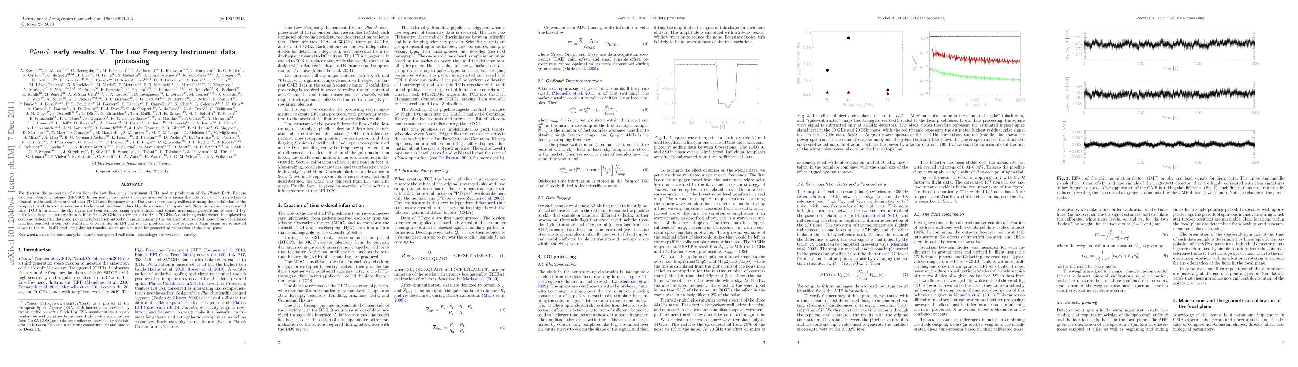 This paper details the processing of Low Frequency Instrument (LFI) data from the Planck satellite, focusing on transforming raw telemetry into calibrated time-ordered data and frequency maps. It employs a destriping code to minimize noise variance and estimates main beams using Jupiter transits for geometrical calibration.