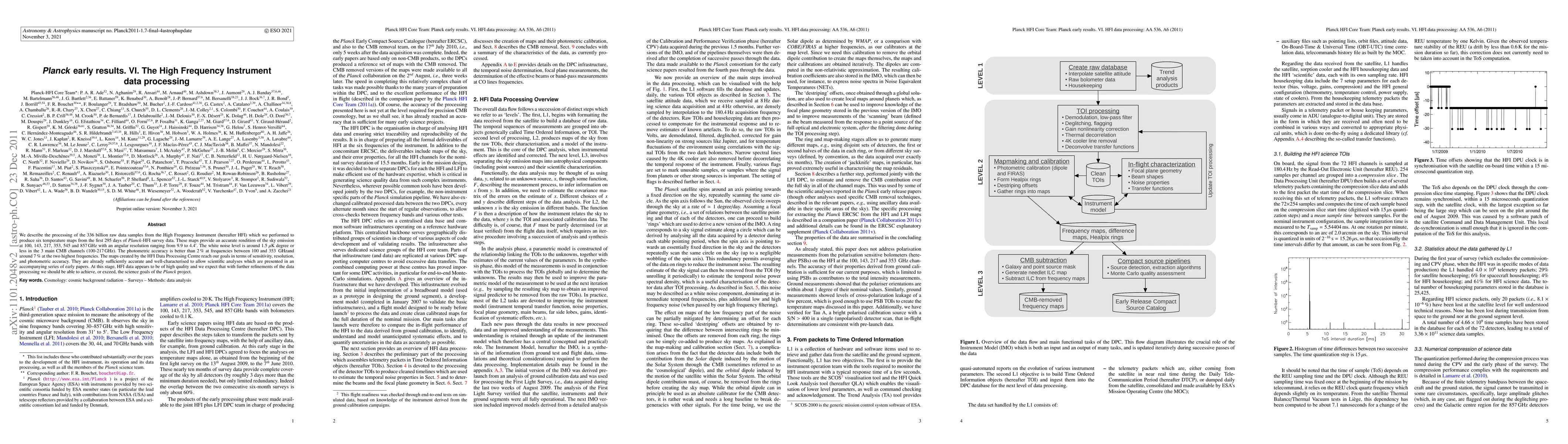 This paper details the processing of 336 billion raw data samples from Planck's High Frequency Instrument (HFI) to create six temperature sky maps at 100, 143, 217, 353, 545, and 857 GHz. The maps show high accuracy with noise levels below 1.5 μK degree and resolution ranging from 9.9 to 4.4 arcminutes. Photometric accuracy is better than 2% for lower frequencies and 7% for higher frequencies. These HFI data products meet Planck's initial sensitivity, resolution, and photometric accuracy goals, enabling early scientific analyses and promising further refinements for achieving or exceeding Planck project science objectives.