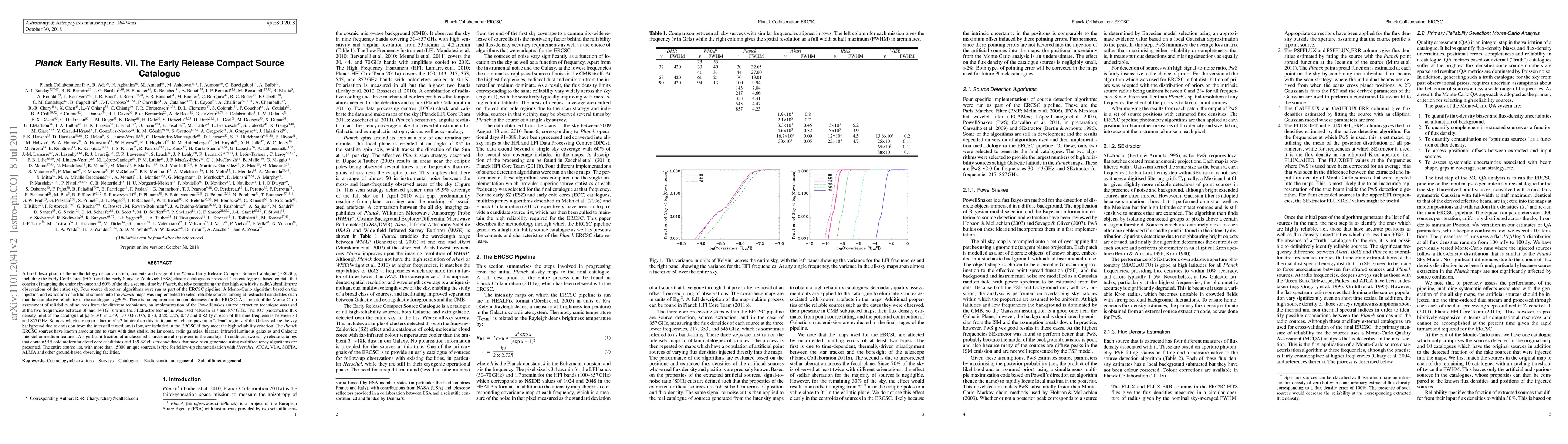 The Planck Early Release Compact Source Catalog (ERCSC) presents over 15,000 reliable astronomical sources identified from high-sensitivity radio/submillimetre sky maps, with a 10σ photometric flux density limit of 0.49 to 0.82 Jy across nine frequencies. It includes sources associated with various astrophysical phenomena and features two additional catalogs for cold molecular cores and Sunyaev-Zeldovich clusters.