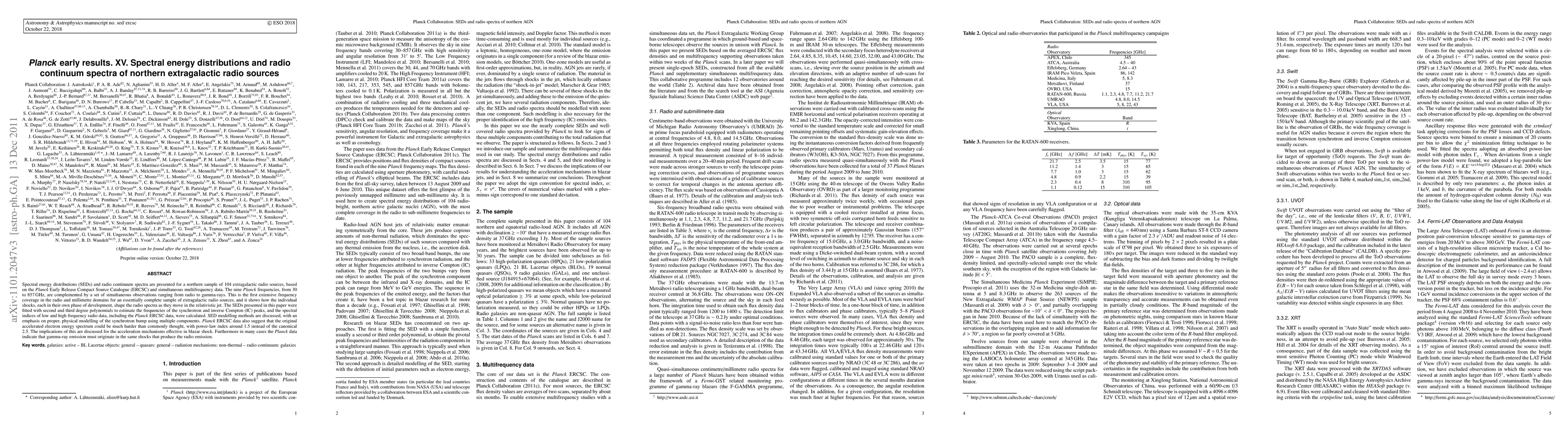 This paper presents spectral energy distributions and radio continuum spectra for 104 extragalactic radio sources using Planck ERCSC and multifrequency data. The study reveals that the original accelerated electron energy spectrum may be harder than previously thought, with implications for blazar shock acceleration mechanisms.
