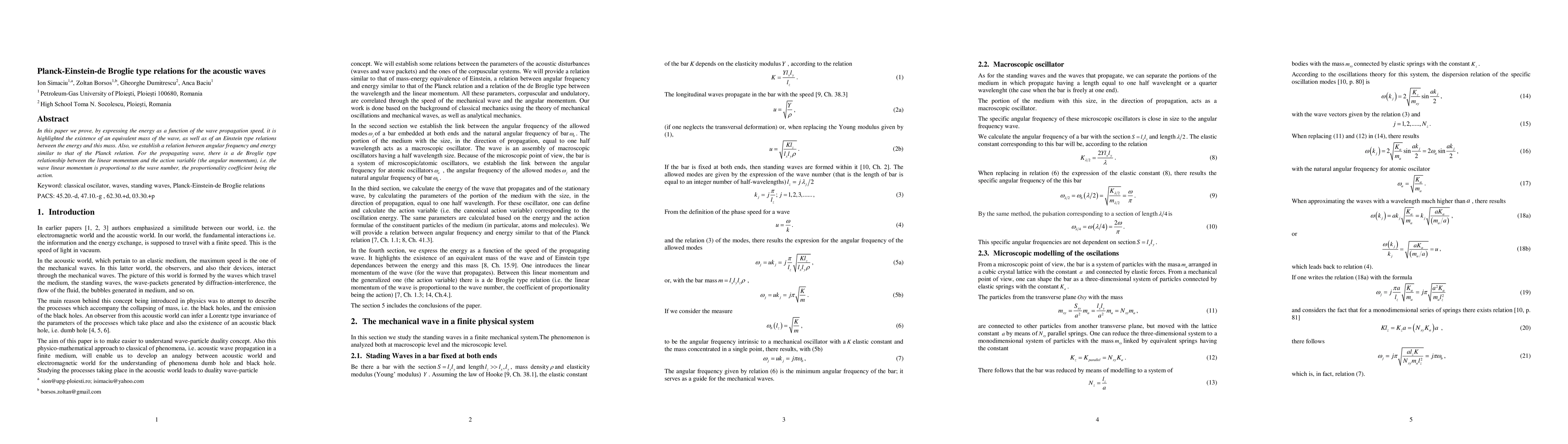 In this paper we prove, by expressing the energy as a function of the wave propagation speed, it is highlighted the existence of an equivalent mass of the wave, as well as of an Einstein type relations between the energy and this mass. Also, we establish a relation between angular frequency and energy similar to that of the Planck relation. For the propagating wave, there is a de Broglie type relationship between the linear momentum and the action variable (the angular momentum), i.e. the wave linear momentum is proportional to the wave number, the proportionality coefficient being the action.