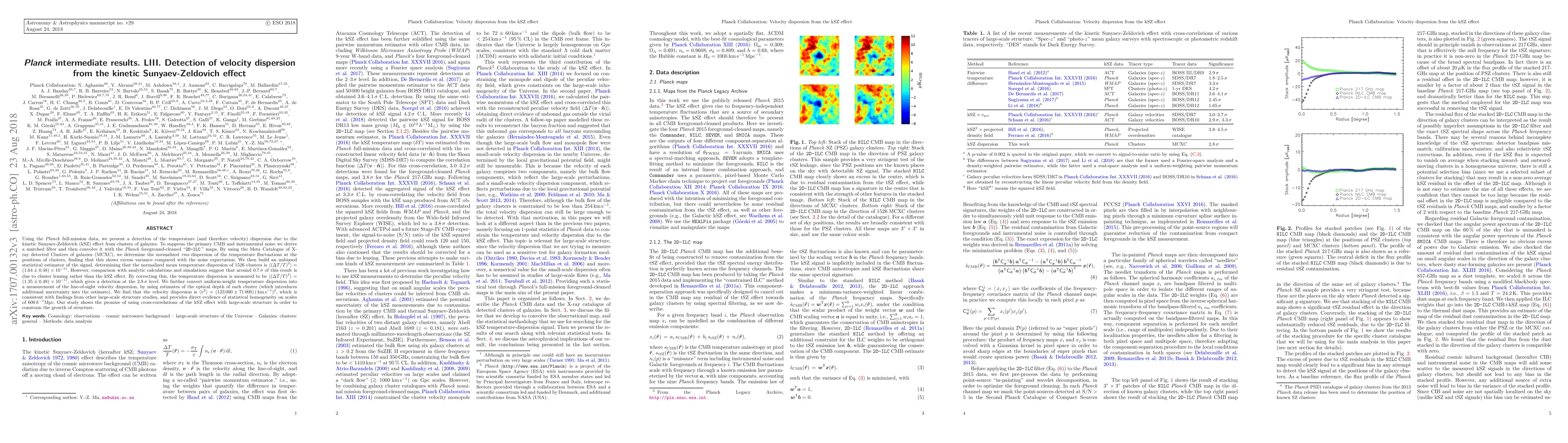 Using the ${\it Planck}$ full-mission data, we present a detection of the temperature (and therefore velocity) dispersion due to the kinetic Sunyaev-Zeldovich (kSZ) effect from clusters of galaxies. To suppress the primary CMB and instrumental noise we derive a matched filter and then convolve it with the ${\it Planck}$ foreground-cleaned `${\tt 2D-ILC\,}$' maps. By using the Meta Catalogue of X-ray detected Clusters of galaxies (MCXC), we determine the normalized ${\it rms}$ dispersion of the temperature fluctuations at the positions of clusters, finding that this shows excess variance compared with the noise expectation. We then build an unbiased statistical estimator of the signal, determining that the normalized mean temperature dispersion of $1526$ clusters is $\langle \left(\Delta T/T \right)^{2} \rangle = (1.64 \pm 0.48) \times 10^{-11}$. However, comparison with analytic calculations and simulations suggest that around $0.7\,\sigma$ of this result is due to cluster lensing rather than the kSZ effect. By correcting this, the temperature dispersion is measured to be $\langle \left(\Delta T/T \right)^{2} \rangle = (1.35 \pm 0.48) \times 10^{-11}$, which gives a detection at the $2.8\,\sigma$ level. We further convert uniform-weight temperature dispersion into a measurement of the line-of-sight velocity dispersion, by using estimates of the optical depth of each cluster (which introduces additional uncertainty into the estimate). We find that the velocity dispersion is $\langle v^{2} \rangle =(123\,000 \pm 71\,000)\,({\rm km}\,{\rm s}^{-1})^{2}$, which is consistent with findings from other large-scale structure studies, and provides direct evidence of statistical homogeneity on scales of $600\,h^{-1}{\rm Mpc}$. Our study shows the promise of using cross-correlations of the kSZ effect with large-scale structure in order to constrain the growth of structure.