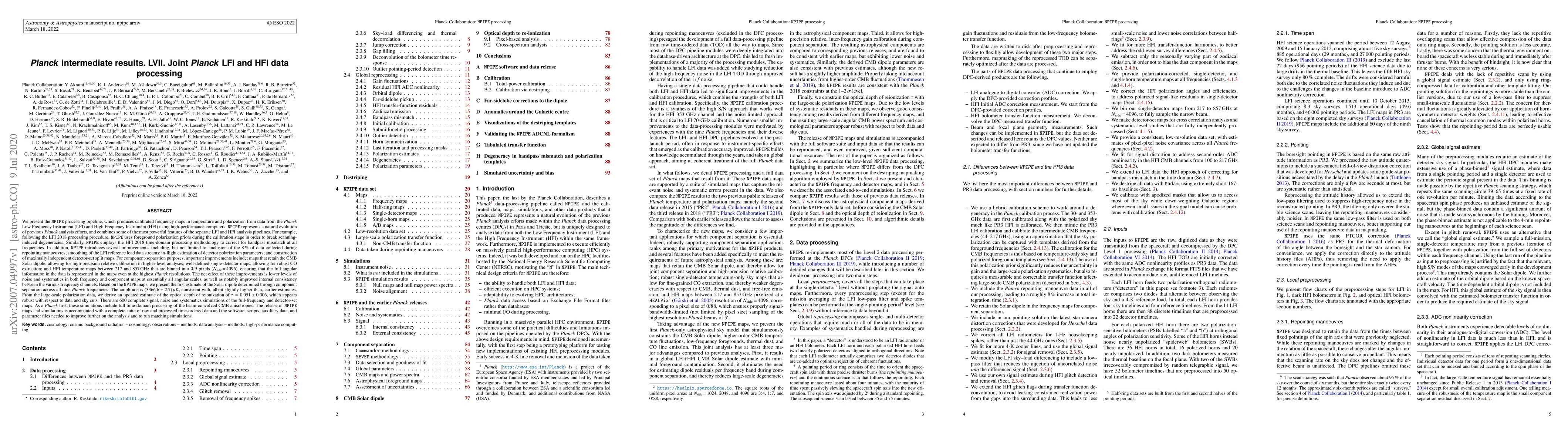 The NPIPE processing pipeline enhances the analysis of Planck LFI and HFI data, achieving lower noise and systematics, and improved consistency across frequency channels. It provides new estimates for the Solar dipole and the optical depth of reionization, along with comprehensive simulations and data release for further analysis.