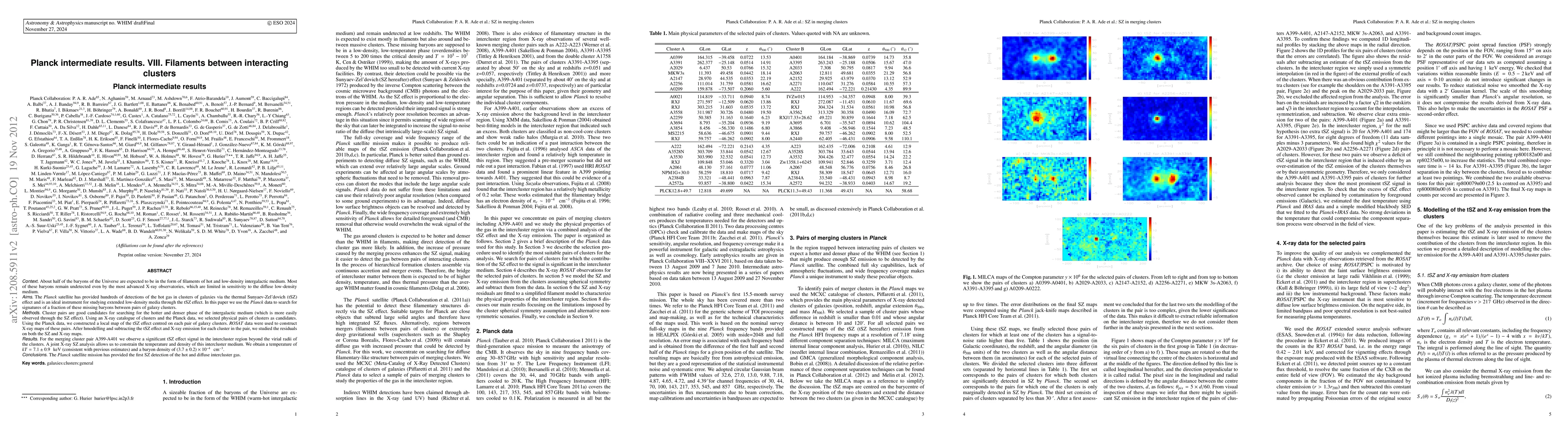 This paper uses Planck satellite data to detect filaments of hot, low-density intergalactic medium between interacting galaxy clusters, specifically the merging pair A399-A401. The study finds a significant thermal Sunyaev-Zel'dovich effect signal, revealing a temperature of kT = 7.1 ± 0.9 keV and a baryon density of (3.7 ± 0.2) x 10^-4 cm^-3.