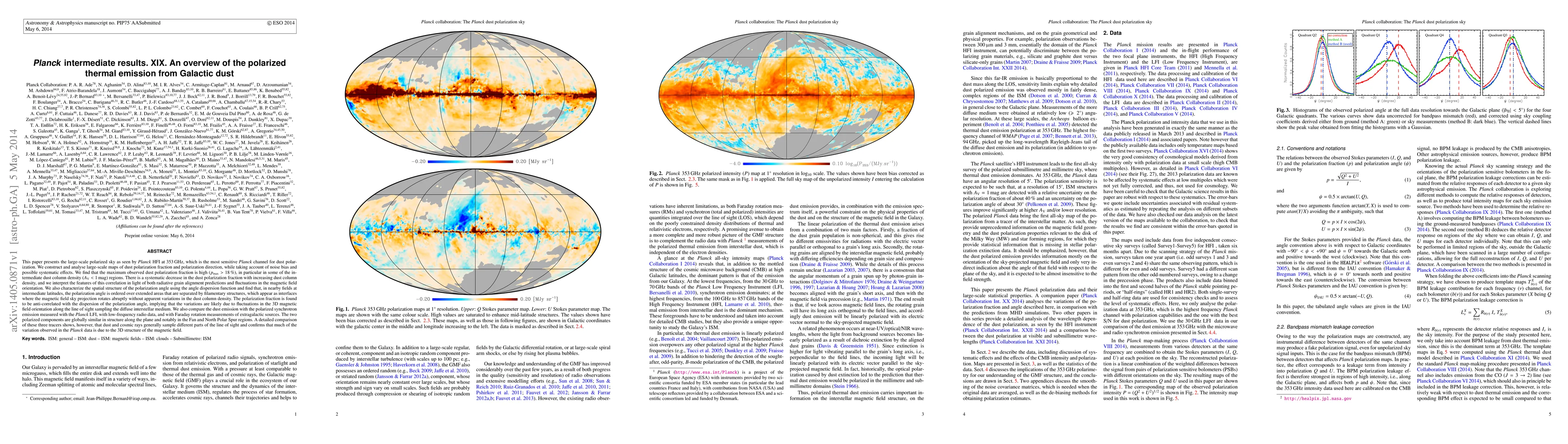 This paper presents large-scale maps of polarized thermal emission from Galactic dust at 353 GHz, revealing a high maximum polarization fraction (pmax > 18%) and a systematic decrease with increasing dust column density, interpreted through radiative grain alignment and magnetic field fluctuations. The polarization angle is ordered over extended areas, suggesting variations due to 3D magnetic field orientation.