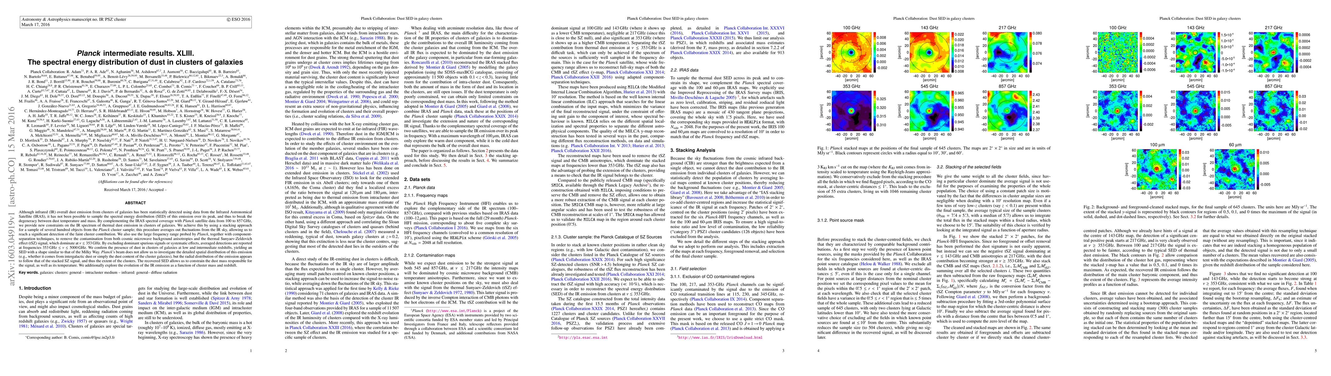 Although infrared (IR) overall dust emission from clusters of galaxies has been statistically detected using data from the Infrared Astronomical Satellite (IRAS), it has not been possible to sample the spectral energy distribution (SED) of this emission over its peak, and thus to break the degeneracy between dust temperature and mass. By complementing the IRAS spectral coverage with Planck satellite data from 100 to 857 GHz, we provide new constraints on the IR spectrum of thermal dust emission in clusters of galaxies. We achieve this by using a stacking approach for a sample of several hundred objects from the Planck cluster sample; this procedure averages out fluctuations from the IR sky, allowing us to reach a significant detection of the faint cluster contribution. We also use the large frequency range probed by Planck, together with component-separation techniques, to remove the contamination from both cosmic microwave background anisotropies and the thermal Sunyaev-Zeldovich effect (tSZ) signal, which dominate below 353 GHz. By excluding dominant spurious signals or systematic effects, averaged detections are reported at frequencies between 353 and 5000 GHz. We confirm the presence of dust in clusters of galaxies at low and intermediate redshifts, yielding an SED with a shape similar to that of the Milky Way. Planck's beam does not allow us to investigate the detailed spatial distribution of this emission (e.g., whether it comes from intergalactic dust or simply the dust content of the cluster galaxies), but the radial distribution of the emission appears to follow that of the stacked SZ signal, and thus the extent of the clusters. The recovered SED allows us to constrain the dust mass responsible for the signal, as well as its temperature. We additionally explore the evolution of the IR emission as a function of cluster mass and redshift.