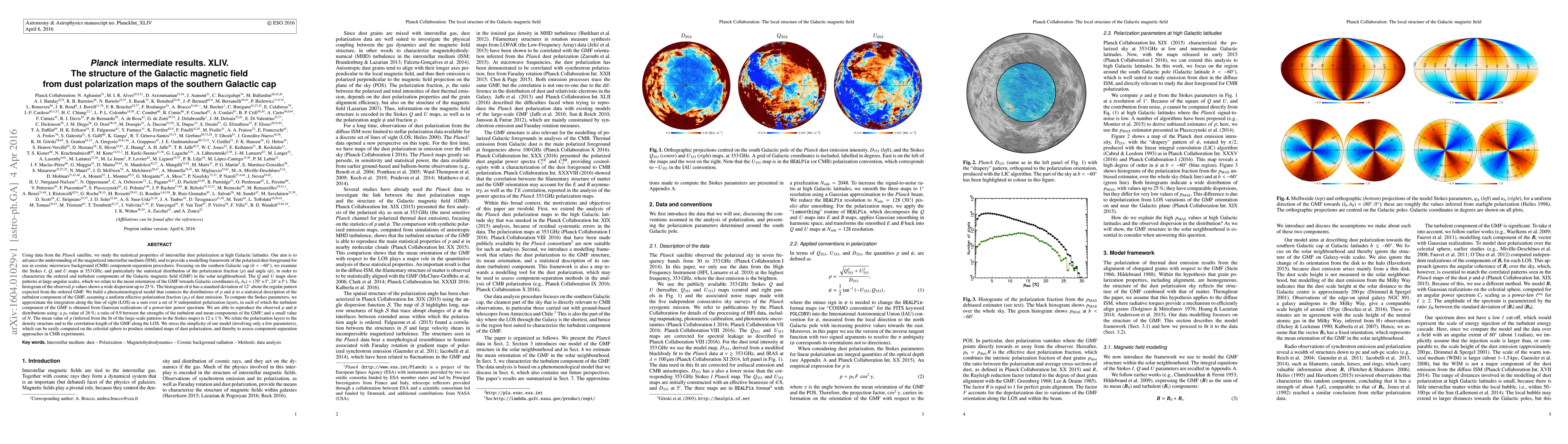 We study the statistical properties of interstellar dust polarization at high Galactic latitude, using the Stokes parameter Planck maps at 353 GHz. Our aim is to advance the understanding of the magnetized interstellar medium (ISM), and to provide a model of the polarized dust foreground for cosmic microwave background component-separation procedures. Focusing on the southern Galactic cap, we examine the statistical distributions of the polarization fraction ($p$) and angle ($\psi$) to characterize the ordered and turbulent components of the Galactic magnetic field (GMF) in the solar neighbourhood. We relate patterns at large angular scales in polarization to the orientation of the mean (ordered) GMF towards Galactic coordinates $(l_0,b_0)=(70^\circ \pm 5^\circ,24^\circ \pm 5^\circ)$. The histogram of $p$ shows a wide dispersion up to 25 %. The histogram of $\psi$ has a standard deviation of $12^\circ$ about the regular pattern expected from the ordered GMF. We use these histograms to build a phenomenological model of the turbulent component of the GMF, assuming a uniform effective polarization fraction ($p_0$) of dust emission. To model the Stokes parameters, we approximate the integration along the line of sight (LOS) as a sum over a set of $N$ independent polarization layers, in each of which the turbulent component of the GMF is obtained from Gaussian realizations of a power-law power spectrum. We are able to reproduce the observed $p$ and $\psi$ distributions using: a $p_0$ value of (26 $\pm$ 3)%; a ratio of 0.9 $\pm$ 0.1 between the strengths of the turbulent and mean components of the GMF; and a small value of $N$. We relate the polarization layers to the density structure and to the correlation length of the GMF along the LOS.