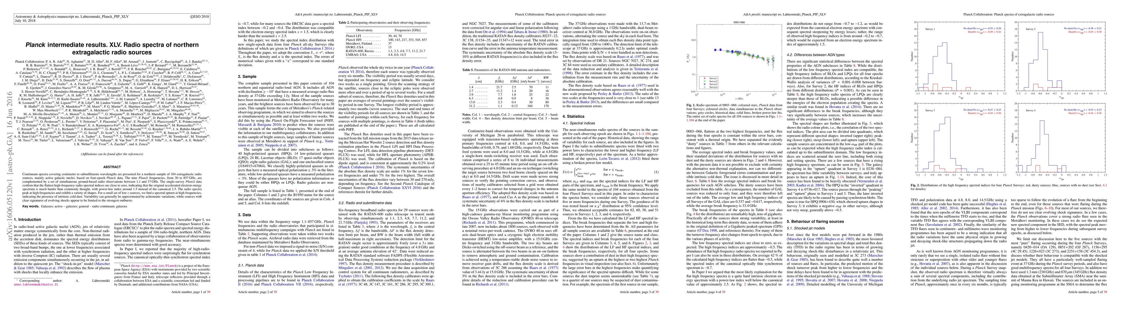 Continuum spectra covering centimetre to submillimetre wavelengths are presented for a northern sample of 104 extragalactic radio sources, mainly active galactic nuclei, based on four-epoch Planck data. The nine Planck frequencies, from 30 to 857 GHz, are complemented by a set of simultaneous ground-based radio observations between 1.1 and 37 GHz. The single-survey Planck data confirm that the flattest high-frequency radio spectral indices are close to zero, indicating that the original accelerated electron energy spectrum is much harder than commonly thought, with power-law index around 1.5 instead of the canonical 2.5. The radio spectra peak at high frequencies and exhibit a variety of shapes. For a small set of low-z sources, we find a spectral upturn at high frequencies, indicating the presence of intrinsic cold dust. Variability can generally be approximated by achromatic variations, while sources with clear signatures of evolving shocks appear to be limited to the strongest outbursts.
