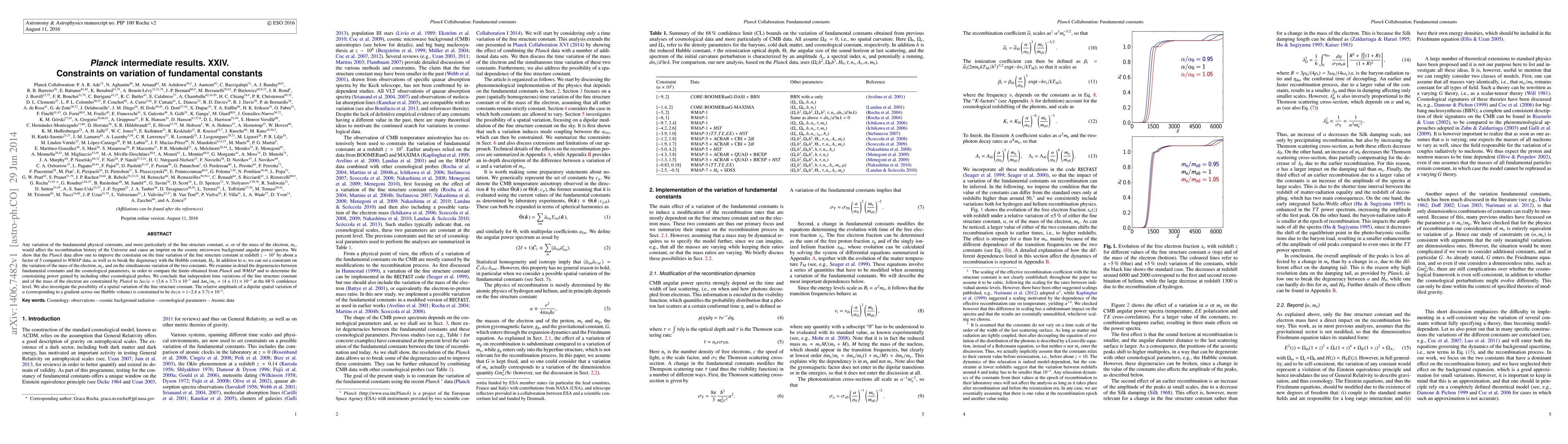 The Planck satellite data significantly improve constraints on the time variation of the fine structure constant $\alpha$ and electron mass $m_e$, achieving a factor of 5 improvement over WMAP data. The study finds ${\Delta\alpha}/{\alpha}= (3.6\pm 3.7)\times10^{-3}$ and ${\Delta m_{\rm e}}/{m_{\rm e}}= (4 \pm 11)\times10^{-3}$ at the 68% confidence level, and rules out significant spatial variations of $\alpha$.