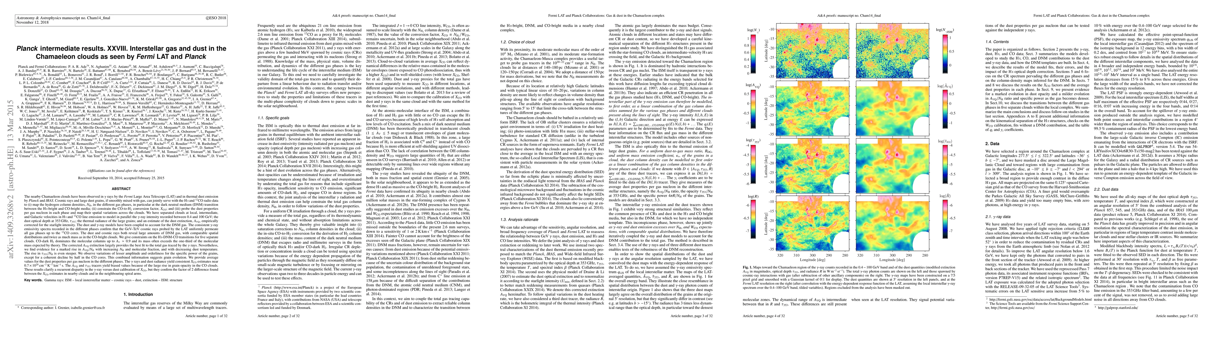 This paper uses Fermi LAT and Planck observations to map gas column densities in the Chamaeleon clouds, constrain the CO-to-$H_2$ conversion factor, and probe dust properties. The study finds that cosmic rays permeate all gas phases and reveals large amounts of dark neutral medium gas, suggesting grain evolution and yielding consistent $X_{CO}$ estimates near $0.7\times10^{20}$ cm$^{-2}$ (K km/s)$^{-1}$.