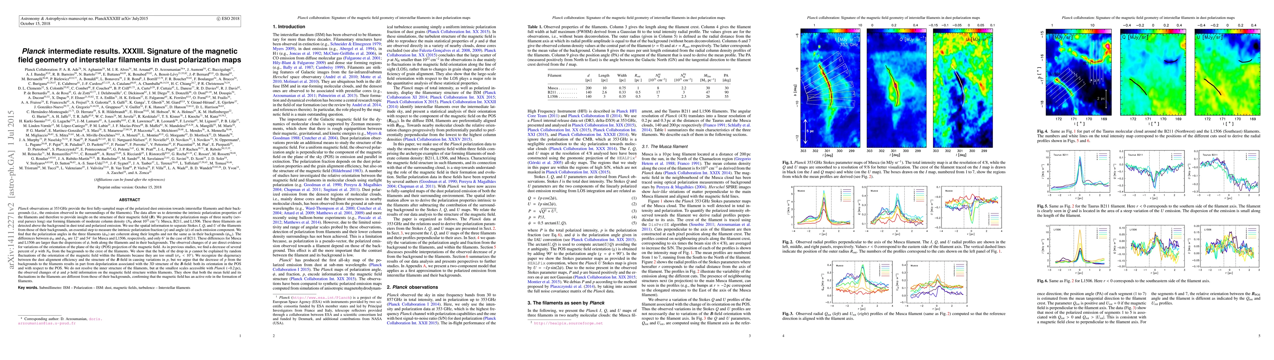 Planck observations at 353GHz provide the first fully-sampled maps of the polarized dust emission towards interstellar filaments and their backgrounds. The polarization data provide insight on the structure of their magnetic field (B). We present the polarization maps of three nearby star forming filament of moderate column density (NH~10^22cm^-2): Musca, B211, and L1506. We use the spatial information to separate Stokes I, Q, and U of the filaments from those of their backgrounds, an essential step to measure the intrinsic polarization fraction (p) and angle (psi) of each emission component. We find that the polarization angles in the three filaments (psi_fil) are coherent along their lengths and not the same as in their backgrounds (psi_bg). The differences between psi_fil and psi_bg are 12deg, 6deg, and 54deg for Musca, B211, and L1506, respectively. These differences for Musca and L1506 are larger than the dispersions of psi, both along the filaments and in their backgrounds. The observed changes of psi are direct evidence for variations of the orientation of the plane of the sky (POS) projection of the B-field. As in previous studies, we find a decrease of several percent of p with NH. We show that the drop in p cannot be explained by random fluctuations of the orientation of B within the filaments because they are too small (sigma_psi<10deg). We recognize the degeneracy between dust alignment efficiency and the structure of B in causing variations in p, but we argue that the decrease of p from the backgrounds to the filaments results in part from depolarization associated with the 3D structure of B: both its orientation in the POS and with respect to the POS. We do not resolve the inner structure of the filaments, but at the smallest scales accessible with Planck (~0.2pc), the observed changes of psi and p hold information on the B-field structure within filaments.