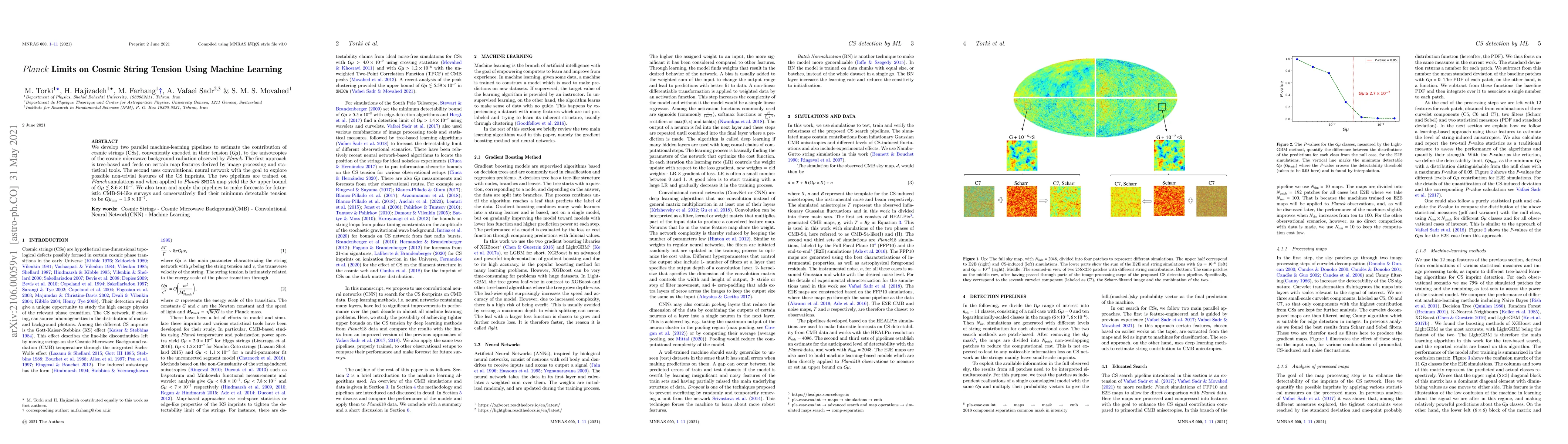 We develop two parallel machine-learning pipelines to estimate the contribution of cosmic strings (CSs), conveniently encoded in their tension ($G\mu$), to the anisotropies of the cosmic microwave background radiation observed by {\it Planck}. The first approach is tree-based and feeds on certain map features derived by image processing and statistical tools. The second uses convolutional neural network with the goal to explore possible non-trivial features of the CS imprints. The two pipelines are trained on {\it Planck} simulations and when applied to {\it Planck} \texttt{SMICA} map yield the $3\sigma$ upper bound of $G\mu\lesssim 8.6\times 10^{-7}$. We also train and apply the pipelines to make forecasts for futuristic CMB-S4-like surveys and conservatively find their minimum detectable tension to be $G\mu_{\rm min}\sim 1.9\times 10^{-7}$.