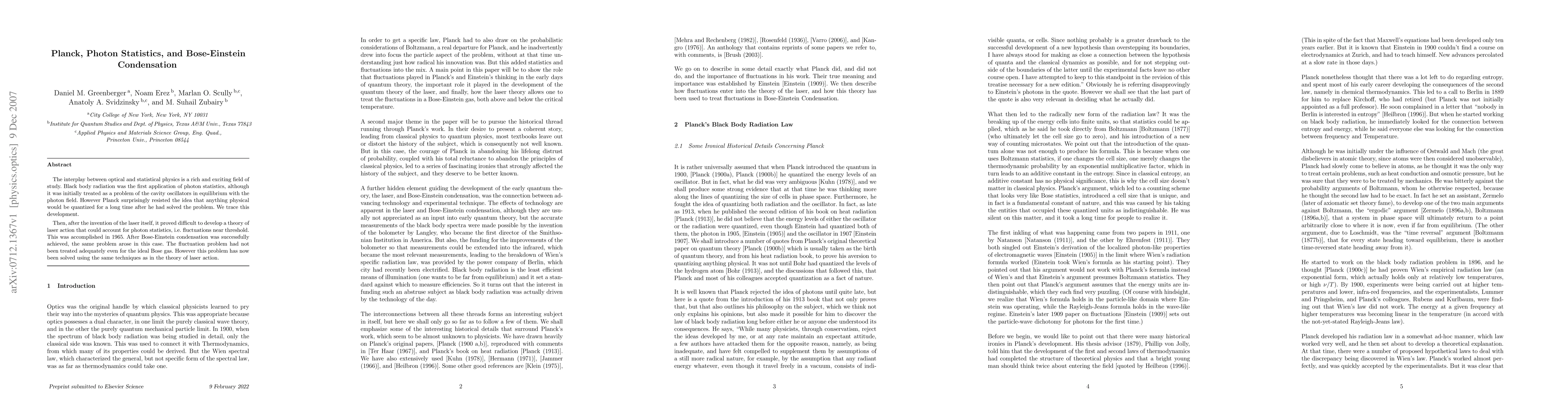 The interplay between optical and statistical physics is a rich and exciting field of study. Black body radiation was the first application of photon statistics, although it was initially treated as a problem of the cavity oscillators in equilibrium with the photon field. However Planck surprisingly resisted the idea that anything physical would be quantized for a long time after he had solved the problem. We trace this development. Then, after the invention of the laser itself, it proved difficult to develop a theory of laser action that could account for photon statistics, i.e. fluctuations near threshold. This was accomplished in 1965. After Bose-Einstein condensation was successfully achieved, the same problem arose in this case. The fluctuation problem had not been treated adequately even for the ideal Bose gas. However this problem has now been solved using the same techniques as in the theory of laser action.