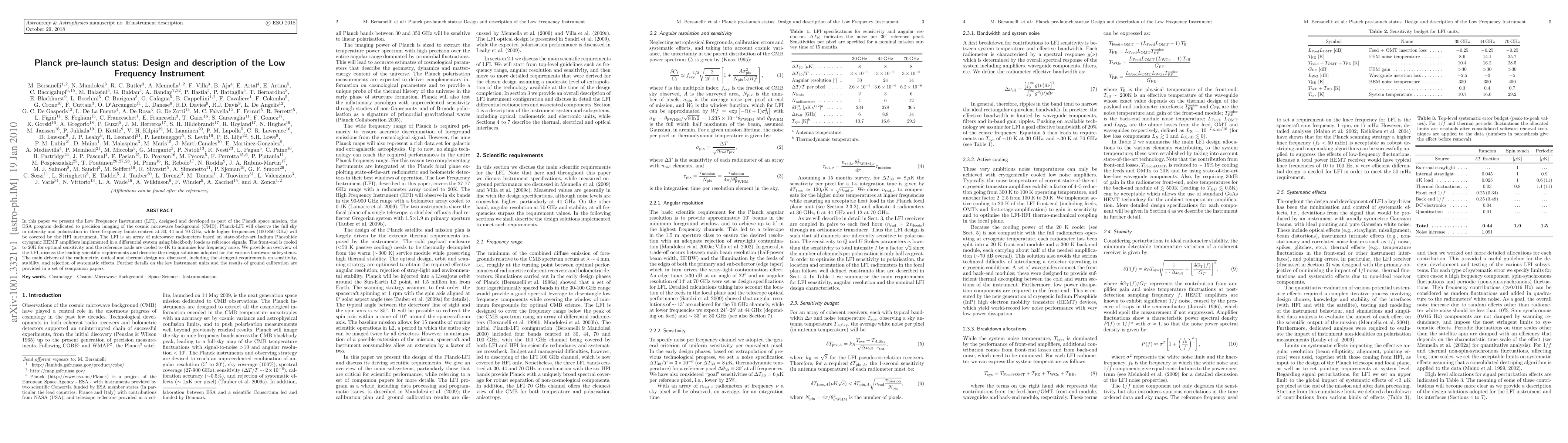 This paper describes the Low Frequency Instrument (LFI) for the Planck space mission, designed to observe the cosmic microwave background in three frequency bands. The LFI uses advanced cryogenic amplifiers and is cooled to optimize sensitivity, focusing on achieving high precision in intensity and polarization measurements.