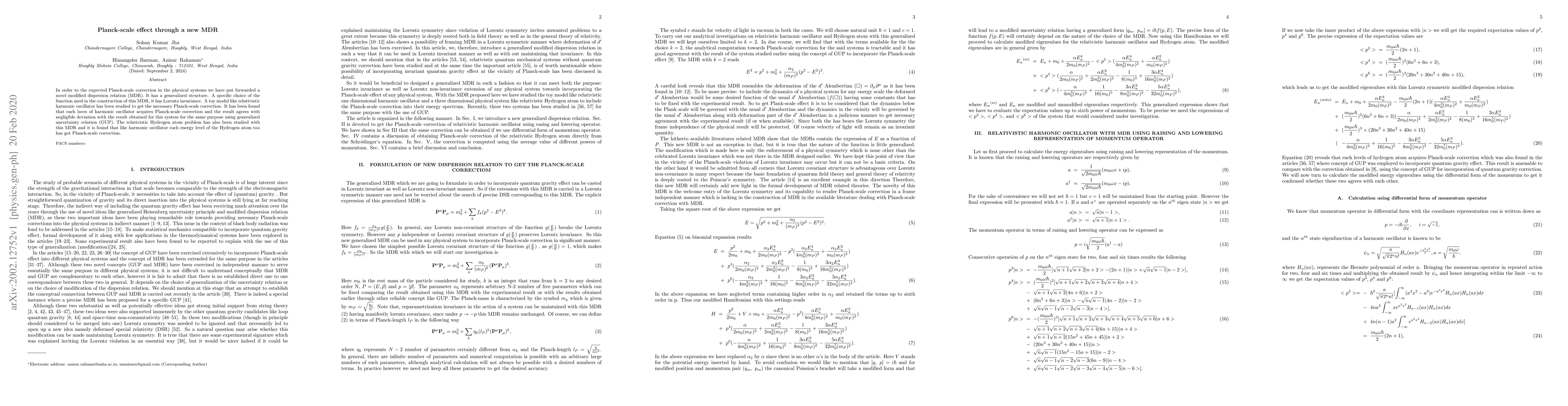 In order to the expected Planck-scale correction in the physical systems we have put forwarded a novel modified dispersion relation (MDR). It has a generalized structure. A specific choice of the function used in the construction of this MDR, it has Lorentz invariance. A toy model like relativistic harmonic oscillator has been studied to get the necessary Planck-scale correction. It has been found that each laves of harmonic oscillator acquires Planck-scale correction and the result agrees with negligible deviation with the result obtained for this system for the same purpose using generalized uncertainty relation (GUP). The relativistic Hydrogen atom problem has also been studied with this MDR and it is found that like harmonic oscillator each energy level of the Hydrogen atom too has got Planck-scale correction.