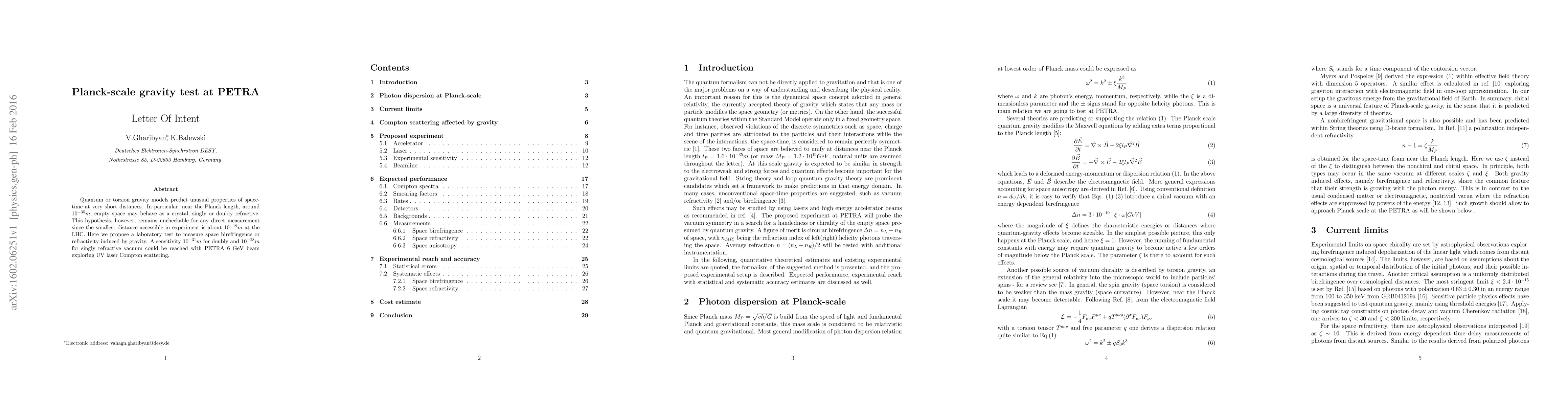 Quantum or torsion gravity models predict unusual properties of space-time at very short distances. In particular, near the Planck length, around $10^{-35}m$, empty space may behave as a crystal, singly or doubly refractive. This hypothesis, however, remains uncheckable for any direct measurement since the smallest distance accessible in experiment is about $10^{-19}m$ at the LHC. Here we propose a laboratory test to measure space birefringence or refractivity induced by gravity. A sensitivity $10^{-31}m$ for doubly and $10^{-28}m$ for singly refractive vacuum could be reached with PETRA 6 GeV beam exploring UV laser Compton scattering.