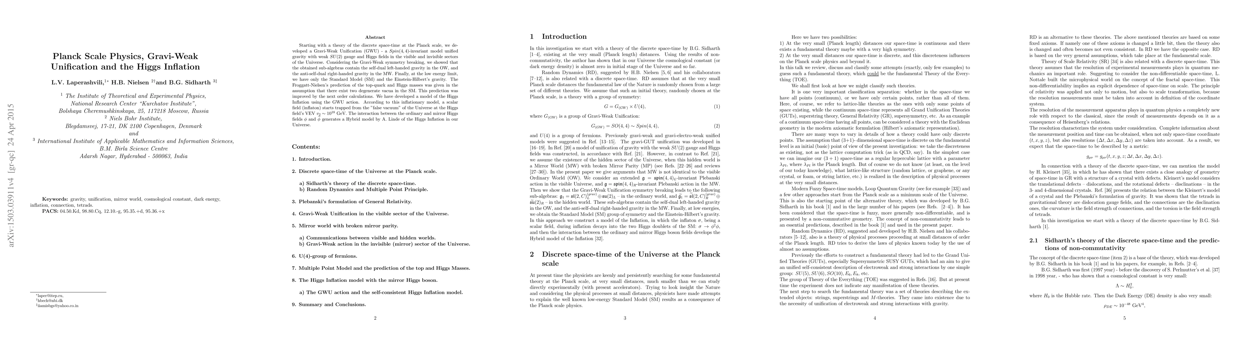 Starting with a theory of the discrete space-time at the Planck scale, we developed a Gravi-Weak Unification (GWU) - a $Spin(4,4)$-invariant model unified gravity with weak $SU(2)$ gauge and Higgs fields in the visible and invisible sectors of the Universe. Considering the Gravi-Weak symmetry breaking, we showed that the obtained sub-algebras contain the self-dual left-handed gravity in the OW, and the anti-self-dual right-handed gravity in the MW. Finally, at the low energy limit, we have only the Standard Model (SM) and the Einstein-Hilbert's gravity. The Froggatt-Nielsen's prediction of the top-quark and Higgs masses was given in the assumption that there exist two degenerate vacua in the SM. This prediction was improved by the next order calculations. We have developed a model of the Higgs Inflation using the GWU action. According to this inflationary model, a scalar field (inflaton) starts trapped from the "false vacuum" of the Universe at the Higgs field's VEV $v_2 \sim 10^{18}$ GeV. The interaction between the ordinary and mirror Higgs fields $\phi$ and $\widetilde{\phi}$ generates a Hybrid model by A.~Linde of the Higgs Inflation in our Universe.