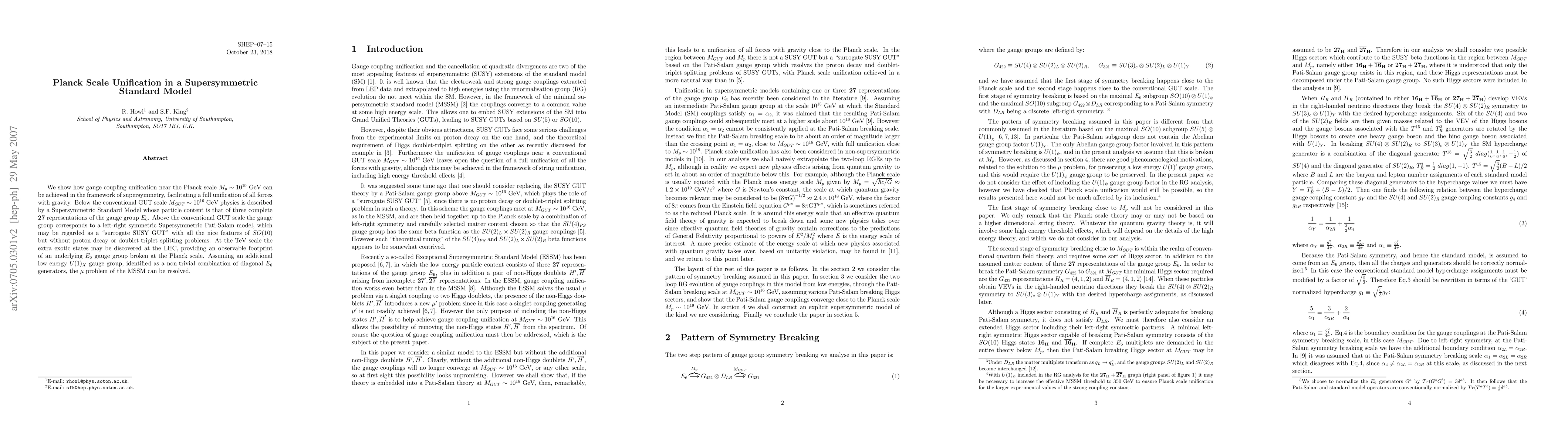 This paper demonstrates gauge coupling unification near the Planck scale within a supersymmetric framework, proposing a Supersymmetric Standard Model based on $E_6$ gauge group representations. It also introduces a left-right symmetric Supersymmetric Pati-Salam model as a surrogate for unification, addressing the $\mu$ problem in the MSSM via an additional $U(1)_X$ gauge group.