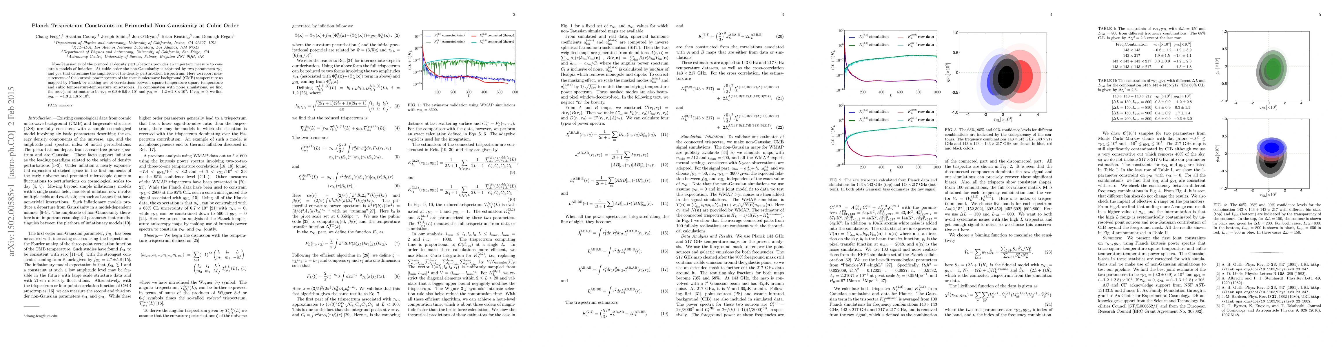 This paper reports on measurements of the Planck cosmic microwave background (CMB) trispectrum to constrain primordial non-Gaussianity at cubic order, yielding best estimates of $\tau_{\rm{NL}}=0.3 \pm 0.9 \times 10^4$ and $g_{\rm{NL}}=-1.2 \pm 2.8 \times 10^5$. These results indicate no strong evidence for primordial non-Gaussianity.