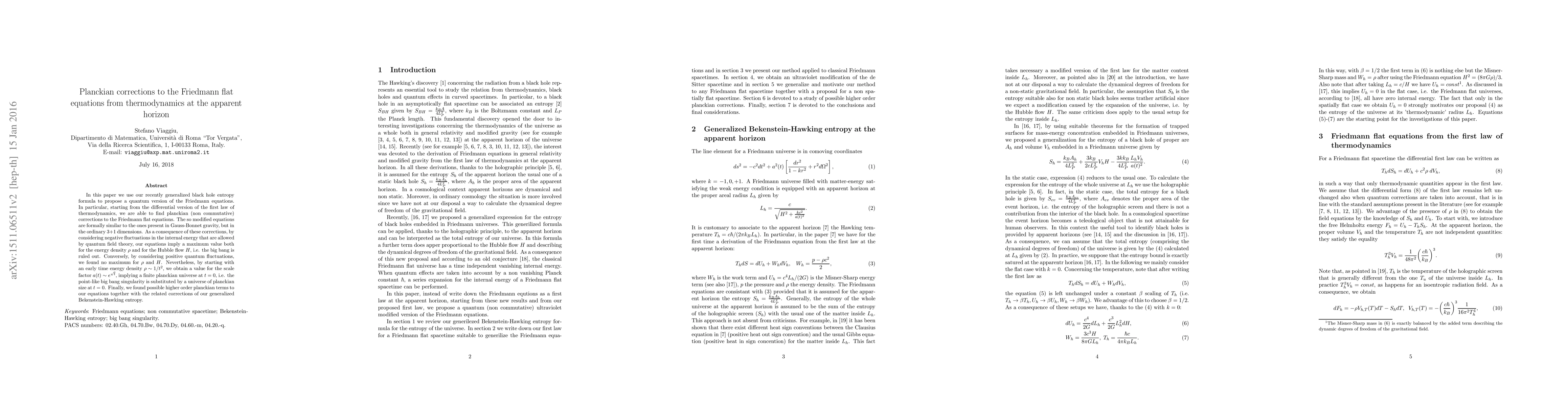 In this paper we use our recently generalized black hole entropy formula to propose a quantum version of the Friedmann equations. In particular, starting from the differential version of the first law of thermodynamics, we are able to find planckian (non commutative) corrections to the Friedmann flat equations. The so modified equations are formally similar to the ones present in Gauss-Bonnet gravity, but in the ordinary 3+1 dimensions. As a consequence of these corrections, by considering negative fluctuations in the internal energy that are allowed by quantum field theory, our equations imply a maximum value both for the energy density $\rho$ and for the Hubble flow $H$, i.e. the big bang is ruled out. Conversely, by considering positive quantum fluctuations, we found no maximum for $\rho$ and $H$. Nevertheless, by starting with an early time energy density $\rho\sim 1/t^2$, we obtain a value for the scale factor $a(t)\sim e^{\sqrt{t}}$, implying a finite planckian universe at $t=0$, i.e. the point-like big bang singularity is substituted by a universe of planckian size at $t=0$. Finally, we found possible higher order planckian terms to our equations together with the related corrections of our generalized Bekenstein-Hawking entropy.