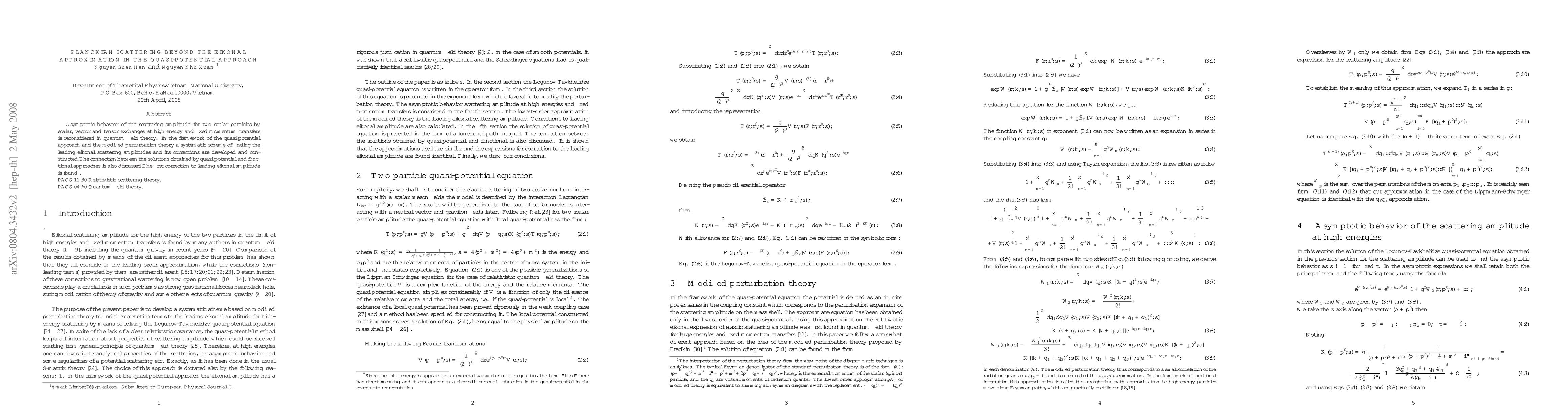 The research employs the quasi-potential approach and modified perturbation theory to systematically find leading eikonal scattering amplitudes and their corrections beyond the eikonal approximation for high-energy, fixed momentum transfer scattering of two scalar particles via scalar, vector, and tensor exchanges.