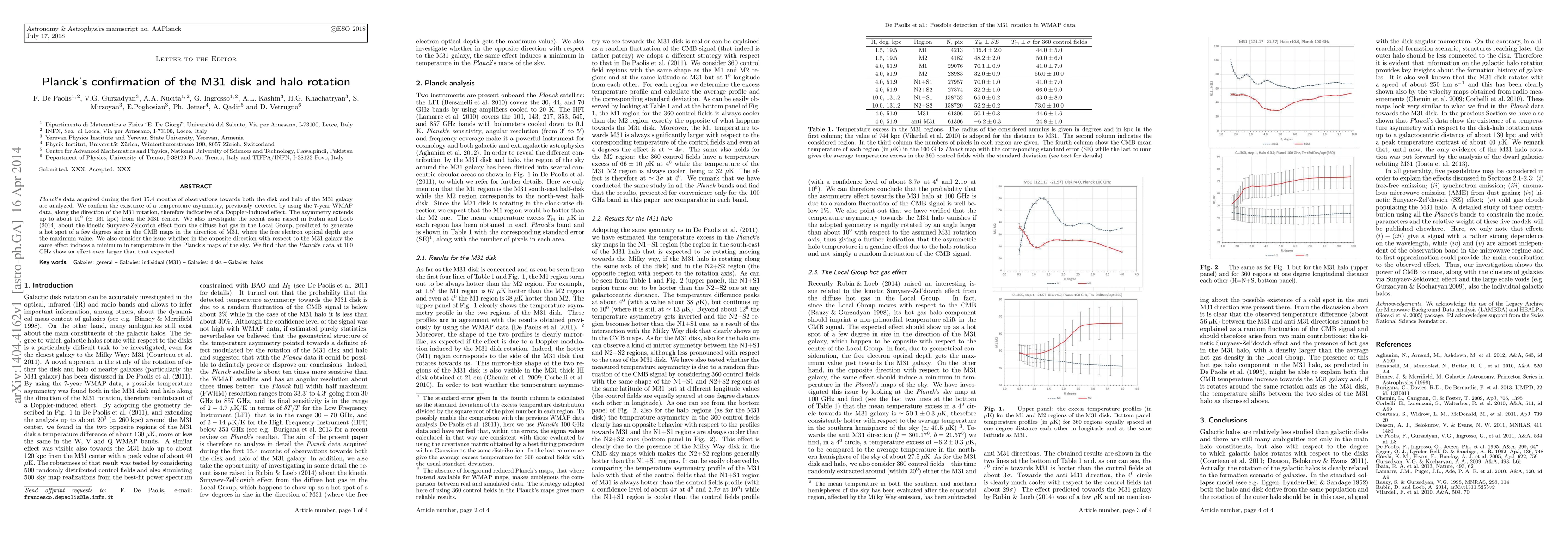Planck's data acquired during the first 15.4 months of observations towards both the disk and halo of the M31 galaxy are analyzed. We confirm the existence of a temperature asymmetry, previously detected by using the 7-year WMAP data, along the direction of the M31 rotation, therefore indicative of a Doppler-induced effect. The asymmetry extends up to about 10 degrees (about 130 kpc) from the M31 center. We also investigate the recent issue raised in Rubin and Loeb (2014) about the kinetic Sunyaev-Zeldovich effect from the diffuse hot gas in the Local Group, predicted to generate a hot spot of a few degrees size in the CMB maps in the direction of M31, where the free electron optical depth gets the maximum value. We also consider the issue whether in the opposite direction with respect to the M31 galaxy the same effect induces a minimum in temperature in the Planck's maps of the sky. We find that the Planck's data at 100 GHz show an effect even larger than that expected.