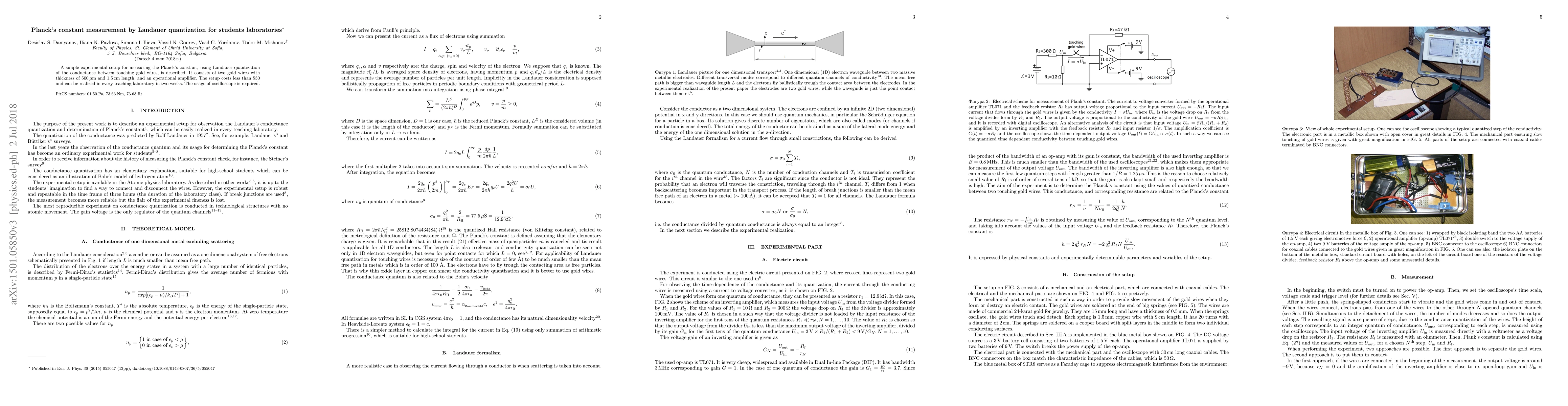 A low-cost experimental setup measures Planck's constant using Landauer quantization of conductance between touching gold wires, accessible for student laboratories, costing under $30.