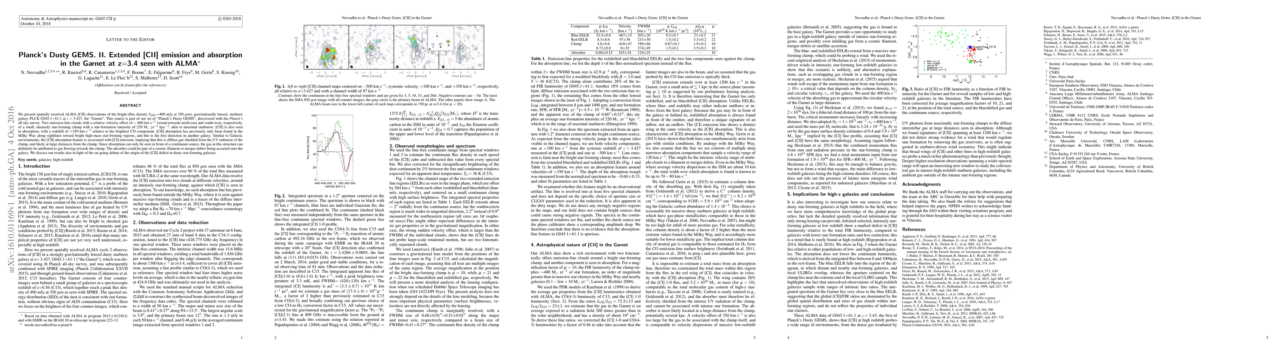 We present spatially resolved ALMA [CII] observations of the bright (flux density S=400 mJy at 350 microns), gravitationally lensed, starburst galaxy PLCK G045.1+61.1 at z=3.427, the "Garnet". This source is part of our set of "Planck's Dusty GEMS", discovered with the Planck's all-sky survey. Two emission-line clouds with a relative velocity offset of ~600 km/s extend towards north-east and south-west, respectively, of a small, intensely star-forming clump with a star-formation intensity of 220 Msun/yr/kpc^2, akin to maximal starbursts. [CII] is also seen in absorption, with a redshift of +350 km/s relative to the brightest CO component. [CII] absorption has previously only been found in the Milky Way along sightlines toward bright high-mass star-forming regions, and this is the first detection in another galaxy. Similar to Galactic environments, the [CII] absorption feature is associated with [CI] emission, implying that this is diffuse gas shielded from the UV radiation of the clump, and likely at large distances from the clump. Since absorption can only be seen in front of a continuum source, the gas in this structure can definitely be attributed to gas flowing towards the clump. The absorber could be part of a cosmic filament or merger debris being accreted onto the galaxy. We discuss our results also in light of the on-going debate of the origin of the [CII] deficit in dusty star-forming galaxies.