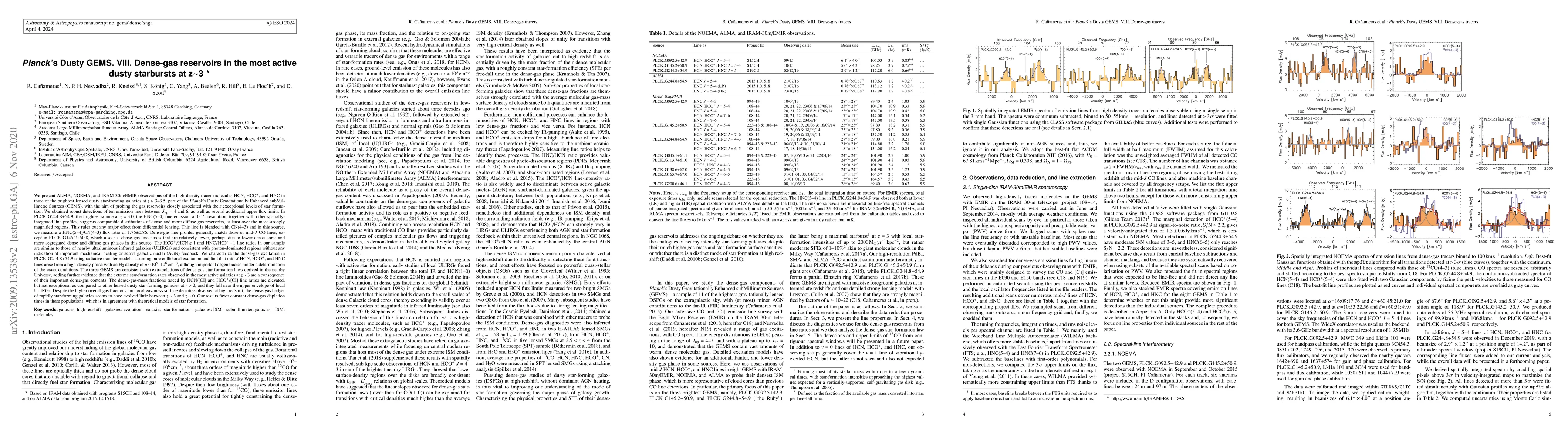 We present ALMA, NOEMA, and IRAM-30m/EMIR observations of the high-density tracer molecules HCN, HCO+, and HNC in three of the brightest lensed dusty star-forming galaxies at z~3-3.5, part of the Planck's Dusty GEMS sample, to probe the gas reservoirs closely associated with their exceptional levels of star formation. We obtain robust detections of ten emission lines between J_up=4 and 6, as well as several additional flux upper limits. In PLCK_G244.8+54.9, the brightest source at z=3.0, the HNC(5-4) line emission at 0.1" resolution, together with other spatially-integrated line profiles, suggests comparable distributions of dense and more diffuse gas reservoirs, at least over the most strongly magnified regions. This rules out any major effect from differential lensing. The HCO+/HCN > 1 and HNC/HCN ~ 1 line ratios in our sample are similar to those of nearby ULIRGs and consistent with photon-dominated regions without any indication of important mechanical heating or AGN feedback. We characterize the dense-gas excitation in PLCK_G244.8+54.9 using radiative transfer models assuming pure collisional excitation and find that mid-J HCN, HCO+, and HNC lines arise from a high-density phase with H2 density n~10^5-6 cm^-3, although important degeneracies prevent determining the exact conditions. The three GEMS are consistent with extrapolations of dense-gas star-formation laws derived in the nearby Universe, adding further evidence that the extreme star-formation rates observed in the most active galaxies at z~3 are a consequence of their important dense-gas contents. The dense-gas-mass fractions traced by HCN/[CI] and HCO+/[CI] line ratios are elevated, but not exceptional compared to other lensed dusty star-forming galaxies at z>2 and fall near the upper envelope of local ULIRGs. Our results also favor constant dense-gas depletion times in these populations.
