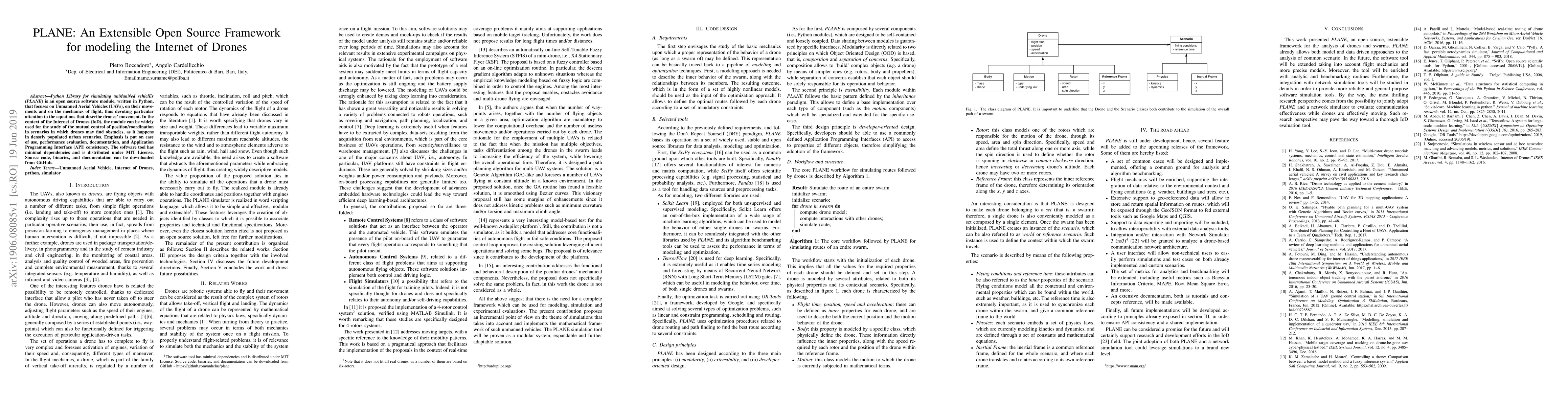 PLANE is an open-source Python library for simulating Unmanned Aerial Vehicles (UAVs) with a focus on their movement mechanics, designed for the Internet of Drones (IoD). It emphasizes ease of use, performance, and API consistency, with minimal dependencies and available on GitHub.