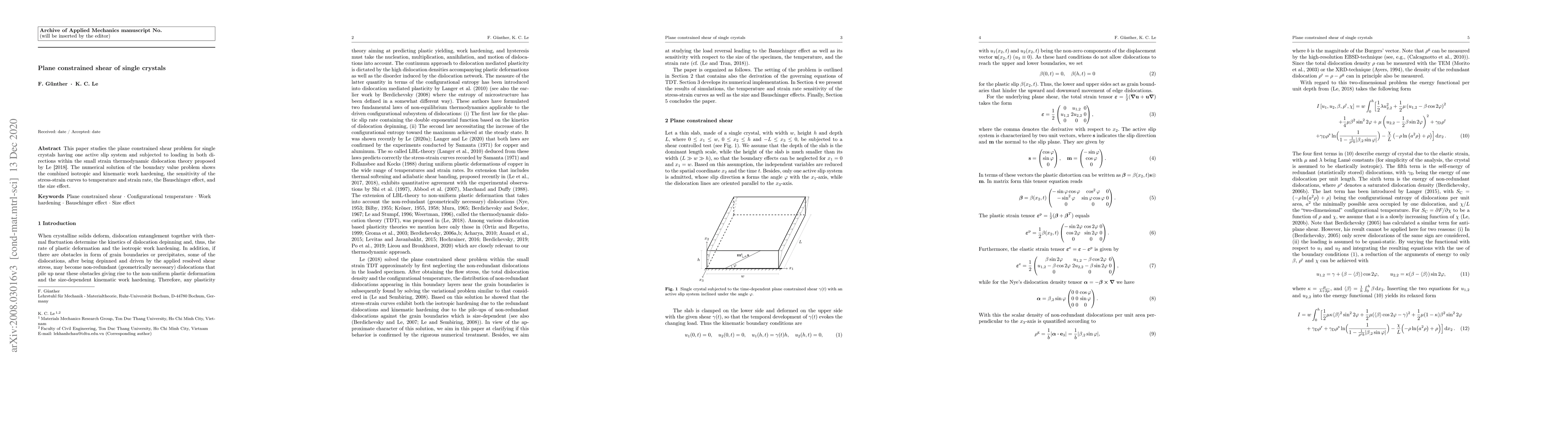 This research examines the deformation of single crystals under plane constrained shear, using Le's (2018) small strain thermodynamic dislocation theory. It reveals findings on isotropic/kinematic work hardening, the influence of temperature and strain rate on stress-strain curves, the Bauschinger effect, and the size effect through numerical boundary value problem solutions.