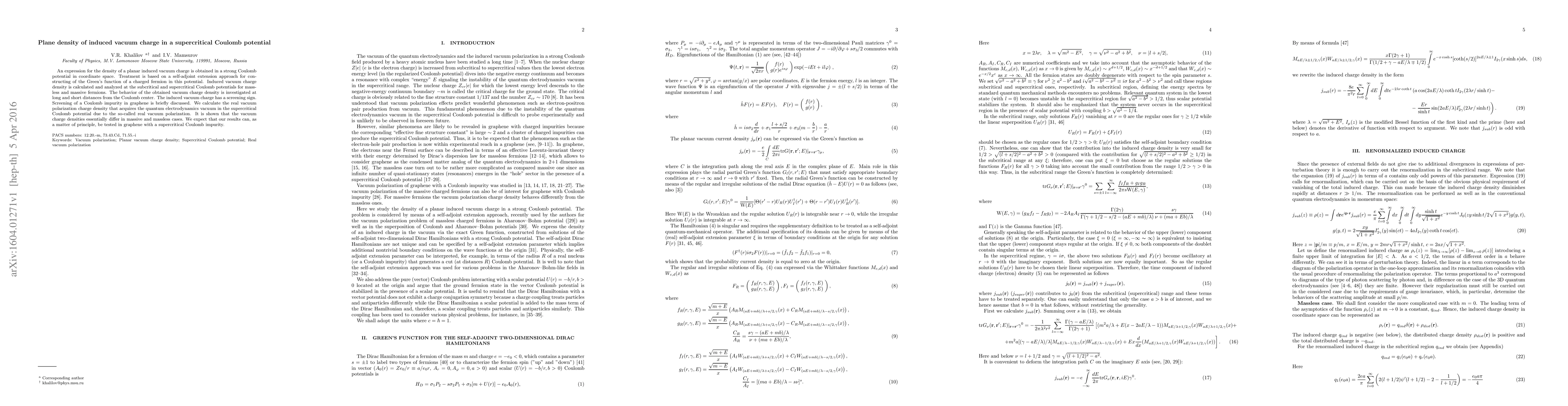 This paper derives the plane density of induced vacuum charge in a supercritical Coulomb potential using a self-adjoint extension method for constructing the Green's function. It compares the behavior of vacuum charge densities for both massive and massless fermions, highlighting significant differences and potential experimental verification in graphene.