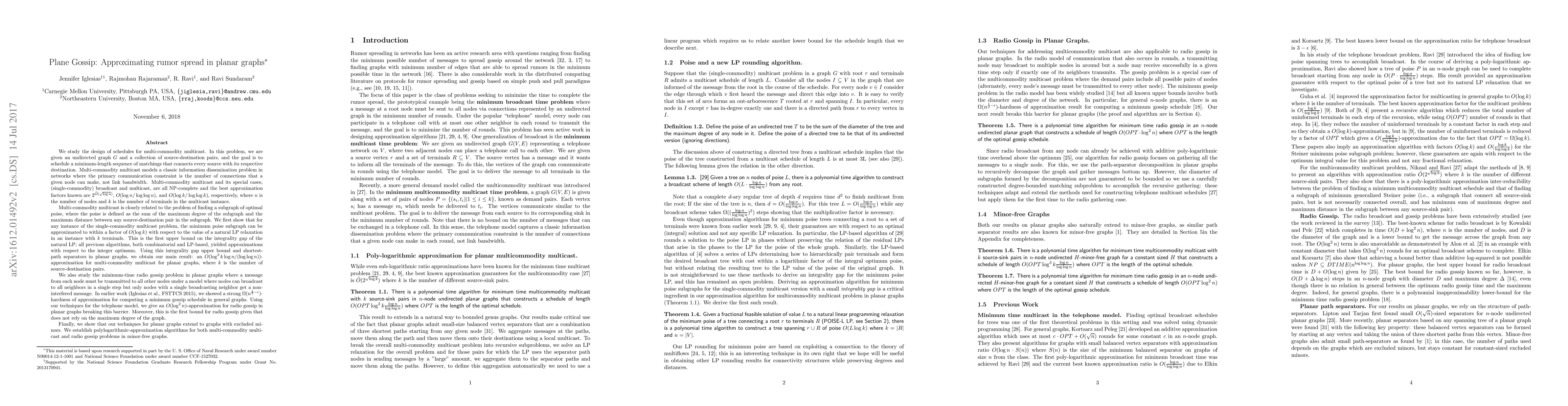 We study the design of schedules for multi-commodity multicast; we are given an undirected graph $G$ and a collection of source destination pairs, and the goal is to schedule a minimum-length sequence of matchings that connects every source with its respective destination. Multi-commodity multicast models a classic information dissemination problem in networks where the primary communication constraint is the number of connections that a node can make, not link bandwidth. Multi-commodity multicast is closely related to the problem of finding a subgraph, $H$, of optimal poise, where the poise is defined as the sum of the maximum degree of $H$ and the maximum distance between any source-destination pair in $H$. We first show that the minimum poise subgraph for single-commodity multicast can be approximated to within a factor of $O(\log k)$ with respect to the value of a natural LP relaxation in an instance with $k$ terminals. This is the first upper bound on the integrality gap of the natural LP. Using this poise result and shortest-path separators in planar graphs, we obtain a $O(\log^3 k\log n/(\log\log n))$-approximation for multi-commodity multicast for planar graphs. We also study the minimum-time radio gossip problem in planar graphs where a message from each node must be transmitted to all other nodes under a model where nodes can broadcast to all neighbors in a single step but only nodes with a single broadcasting neighbor get a message. We give an $O(\log^2 n)$-approximation for radio gossip in planar graphs breaking previous barriers. This is the first bound for radio gossip that does not rely on the maximum degree of the graph. Finally, we show that our techniques for planar graphs extend to graphs with excluded minors. We establish polylogarithmic-approximation algorithms for both multi-commodity multicast and radio gossip problems in minor-free graphs.