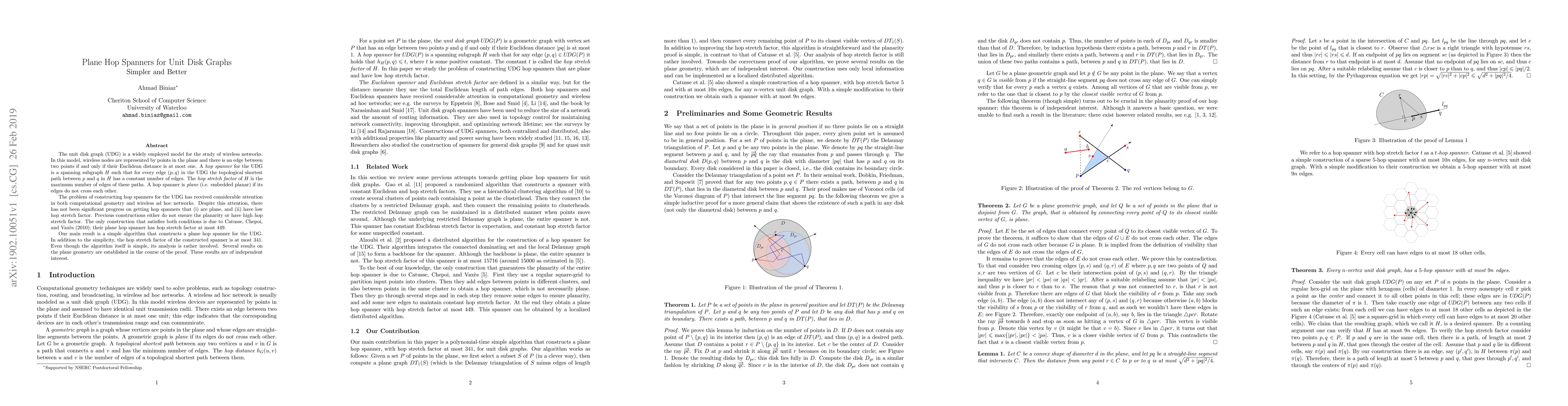 The unit disk graph (UDG) is a widely employed model for the study of wireless networks. In this model, wireless nodes are represented by points in the plane and there is an edge between two points if and only if their Euclidean distance is at most one. A hop spanner for the UDG is a spanning subgraph $H$ such that for every edge $(p,q)$ in the UDG the topological shortest path between $p$ and $q$ in $H$ has a constant number of edges. The hop stretch factor of $H$ is the maximum number of edges of these paths. A hop spanner is plane (i.e. embedded planar) if its edges do not cross each other. The problem of constructing hop spanners for the UDG has received considerable attention in both computational geometry and wireless ad hoc networks. Despite this attention, there has not been significant progress on getting hop spanners that (i) are plane, and (ii) have low hop stretch factor. Previous constructions either do not ensure the planarity or have high hop stretch factor. The only construction that satisfies both conditions is due to Catusse, Chepoi, and Vax\`{e}s (2010); their plane hop spanner has hop stretch factor at most 449. Our main result is a simple algorithm that constructs a plane hop spanner for the UDG. In addition to the simplicity, the hop stretch factor of the constructed spanner is at most 341. Even though the algorithm itself is simple, its analysis is rather involved. Several results on the plane geometry are established in the course of the proof. These results are of independent interest.