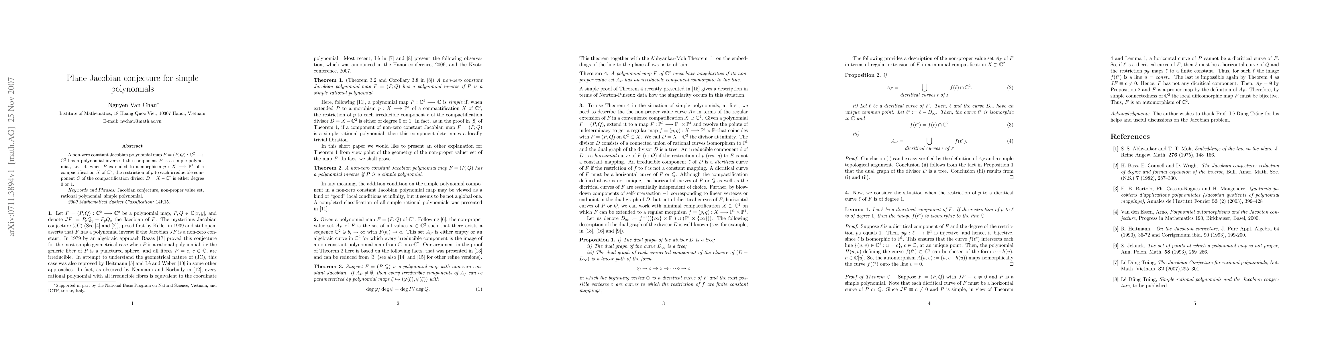 A non-zero constant Jacobian polynomial map $F=(P,Q):\mathbb{C}^2 \longrightarrow \mathbb{C}^2$ has a polynomial inverse if the component $P$ is a simple polynomial, i.e. if, when $P$ extended to a morphism $p:X\longrightarrow \mathbb{P}^1$ of a compactification $X$ of $\mathbb{C}^2$, the restriction of $p$ to each irreducible component $C$ of the compactification divisor $D = X-\mathbb{C}^2$ is either degree 0 or 1.