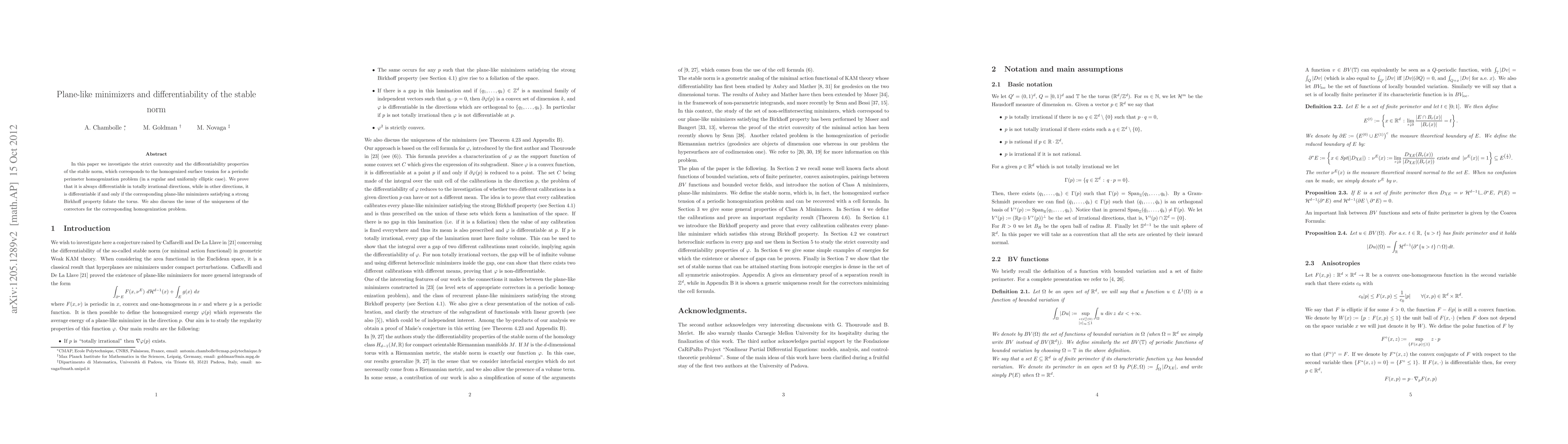 This paper explores the strict convexity and differentiability of the stable norm in periodic homogenization, proving its differentiability in totally irrational directions and linking differentiability in other directions to the presence of plane-like minimizers with a strong Birkhoff property. It also addresses the uniqueness of correctors in the homogenization problem.