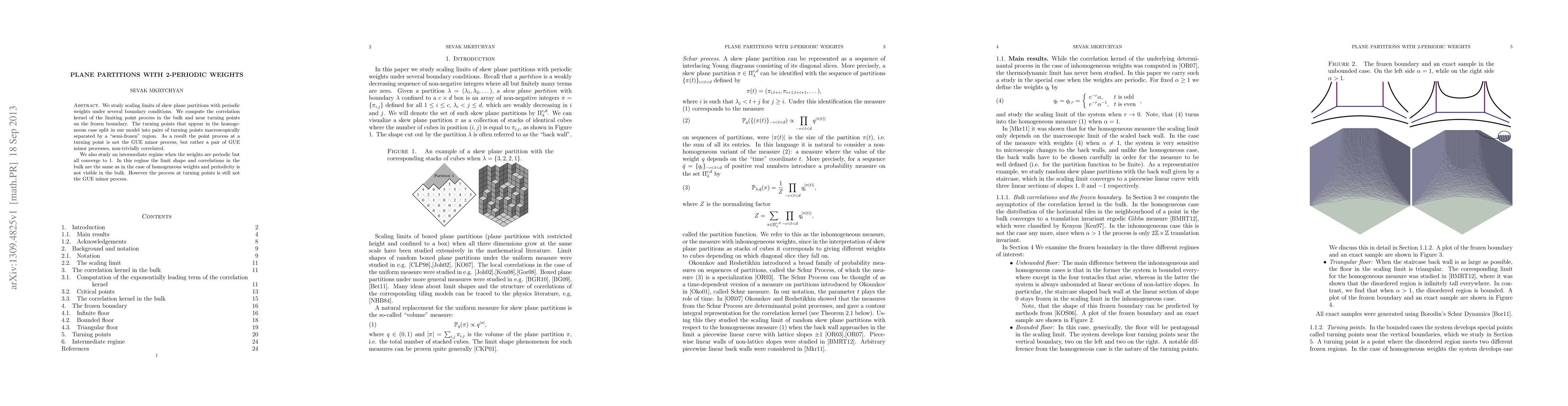 This paper investigates scaling limits of skew plane partitions with 2-periodic weights, revealing a correlation kernel for the limiting point process. It finds that turning points split into correlated pairs of GUE minor processes, differing from the homogeneous case, and explores an intermediate regime where periodicity is not visible in the bulk but still affects turning points.