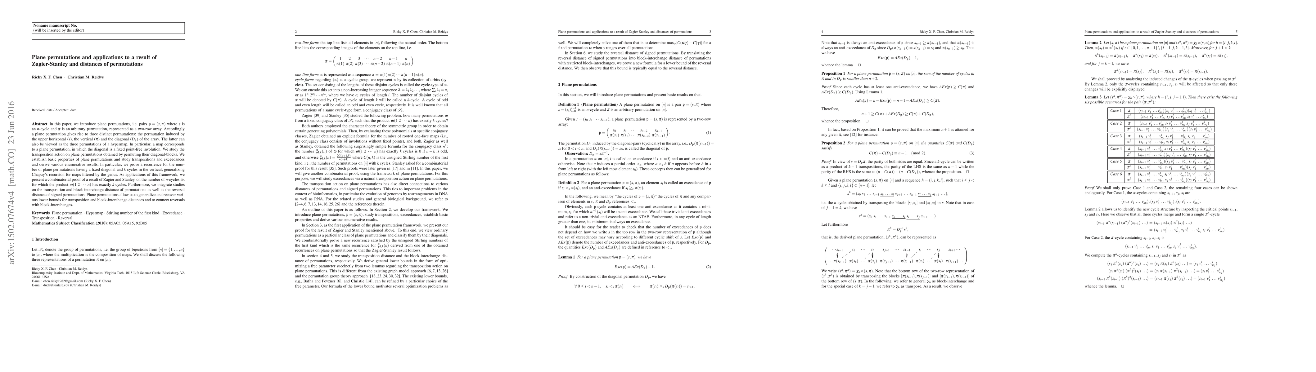 In this paper, we introduce plane permutations, i.e. pairs $\mathfrak{p}=(s,\pi)$ where $s$ is an $n$-cycle and $\pi$ is an arbitrary permutation, represented as a two-row array. Accordingly a plane permutation gives rise to three distinct permutations: the permutation induced by the upper horizontal ($s$), the vertical $\pi$) and the diagonal ($D_{\mathfrak{p}}$) of the array. The latter can also be viewed as the three permutations of a hypermap. In particular, a map corresponds to a plane permutation, in which the diagonal is a fixed point-free involution. We study the transposition action on plane permutations obtained by permuting their diagonal-blocks. We establish basic properties of plane permutations and study transpositions and exceedances and derive various enumerative results. In particular, we prove a recurrence for the number of plane permutations having a fixed diagonal and $k$ cycles in the vertical, generalizing Chapuy's recursion for maps filtered by the genus. As applications of this framework, we present a combinatorial proof of a result of Zagier and Stanley, on the number of $n$-cycles $\omega$, for which the product $\omega(1~2~\cdots ~n)$ has exactly $k$ cycles. Furthermore, we integrate studies on the transposition and block-interchange distance of permutations as well as the reversal distance of signed permutations. Plane permutations allow us to generalize and recover various lower bounds for transposition and block-interchange distances and to connect reversals with block-interchanges.