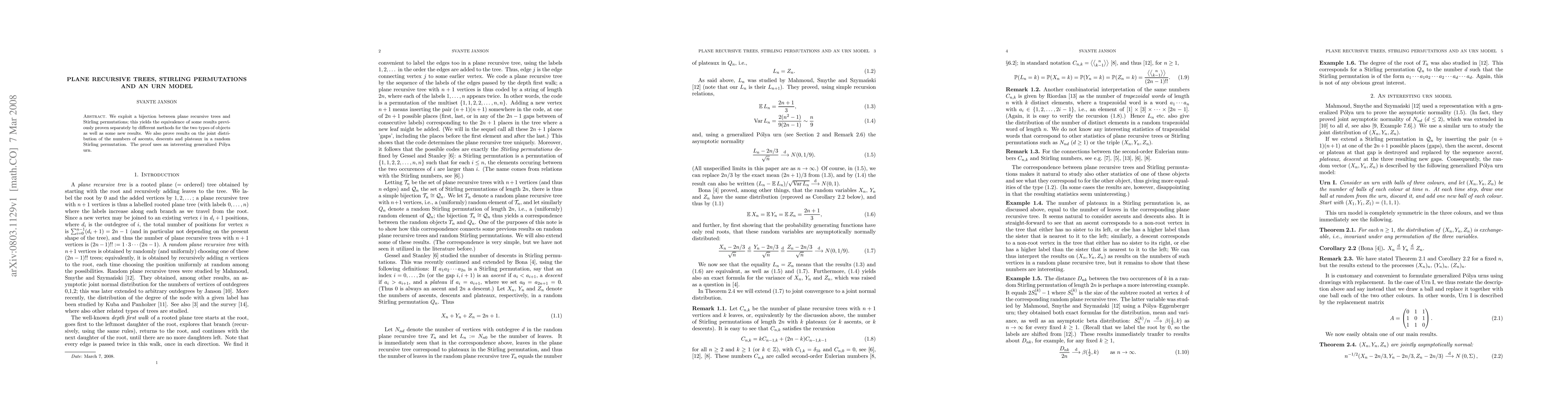 This paper establishes a bijection between plane recursive trees and Stirling permutations, leading to equivalent results previously proven separately and new findings. It also examines the joint distribution of ascents, descents, and plateaux in random Stirling permutations, using a generalized Polya urn model for the proof.