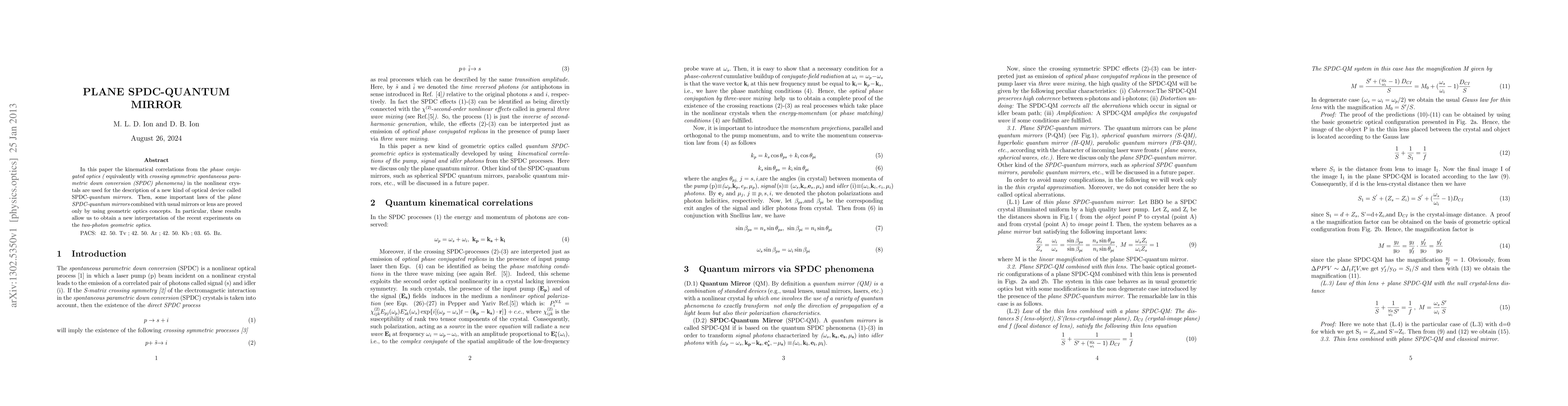 In this paper the kinematical correlations from the phase conjugated optics (equivalently with crossing symmetric spontaneous parametric down conversion (SPDC) phenomena) in the nonlinear crystals are used for the description of a new kind of optical device called SPDC-quantum mirrors. Then, some important laws of the plane SPDC-quantum mirrors combined with usual mirrors or lens are proved only by using geometric optics concepts. In particular, these results allow us to obtain a new interpretation of the recent experiments on the two-photon geometric optics.